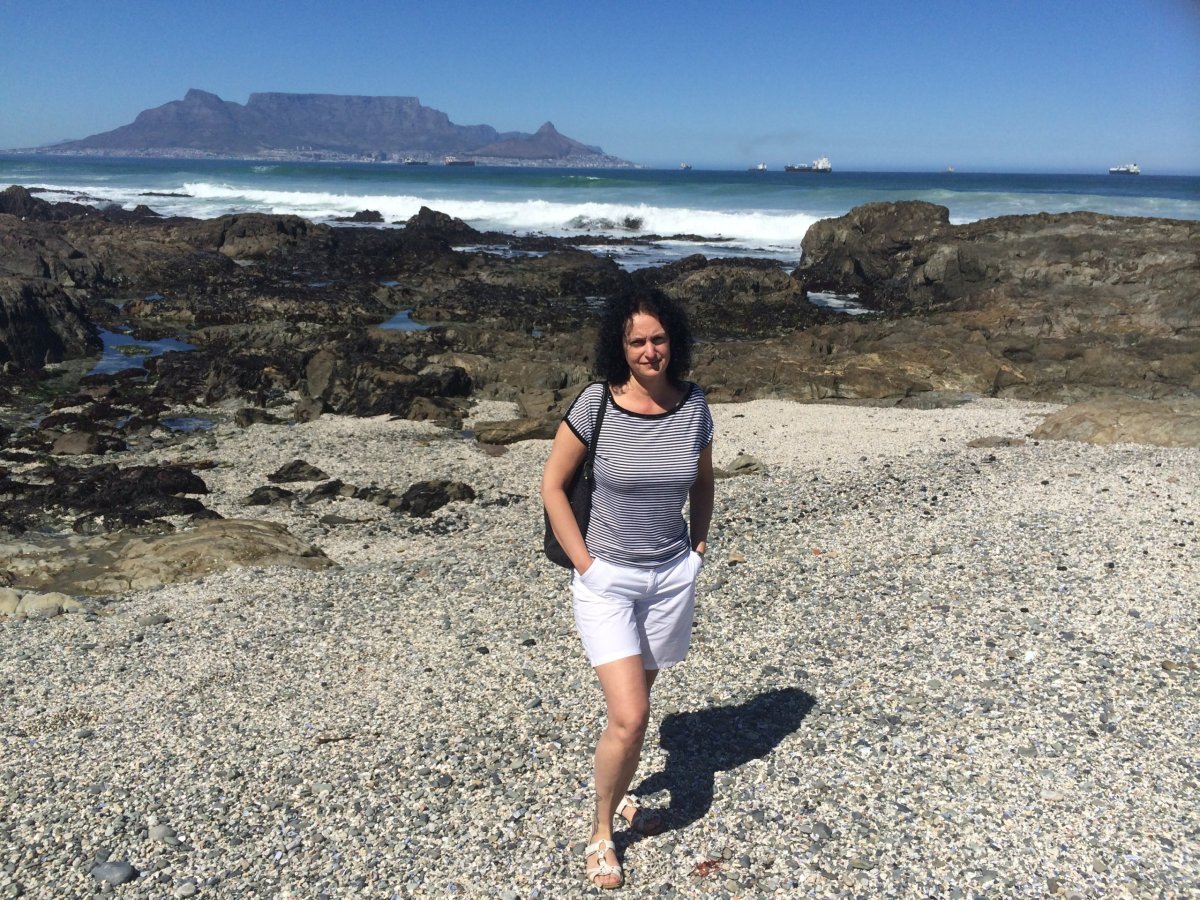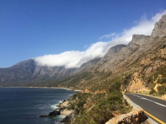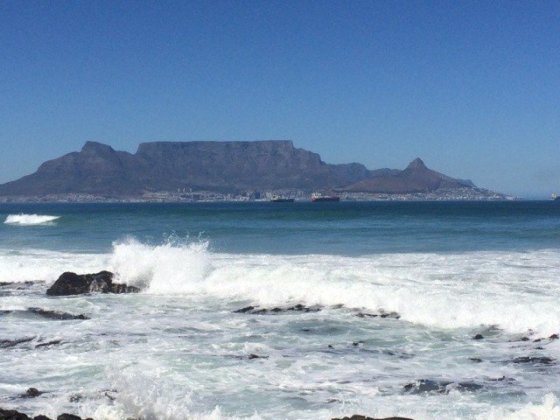 Poznatek č. 4: když vás vedou cedule, skončí ve chvíli, kdy fakt není logicky odvoditelné, jak dál. Takže jsme skončili na nějakém parkovišti. Svačící Francouzka nám naštěstí poradila, takže jsme po dvou kilometrech dojeli k pásu pláže, odkud je nejhezčí pohled na Stolovou horu. Na pláži bylo jen pár lidí, pěkně foukalo, do vody jsme ani nestrčili nohu. Zato jsme fotili ostošest a užívali si to bouření vln. Přesunuli jsme se o 3 kilometry severně do Bloubergstrand, malého letoviska plného vilek u silnice. Při hledání ubytování se mi tam nabízely nějaké apartmány, ale přišlo mi to daleko, ještěže jsem to zavrhla. Ne tak místní restauraci s výhledem, kde jsme si v poledne dali za dvacku kafe s výhledem.