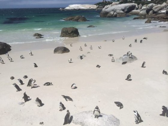 Muzeum bylo velké, včetně ponorky a Honzík si to vážně užil. Před polednem jsme si koupili lístek na Boulders beach a bylo to vlastně jediné pořádné koupání v moři. Atlantik je opravdu hodně studený, ale tady byla pláž chráněná před větrem a voda byla mělká a trochu prohřátá. Vydala jsem se lézt po těch obrovských kamenech a snažila se dostat co nejdál, abych viděla tučňáky jak v písku, tak ve vodě. Miluju je od malička a koupat se s nimi, byl docela prima zážitek, ale sáhnout na sebe nenechají. Honza zatím ležel na pláži. Fotila jsem, točila, půl hoďky chodila vodou a za tu dobu jsem se totálně spálila.