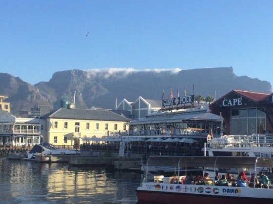Na kopci, s nádherným výhledem jak od bazénu, tak z našeho apartmánu, jsme zůstali dvě noci. Katrin, Němka, žijící v JAR už patnáct let, nám uvařila kafe, donesla muffiny a vodu, vysvětlila pravidla fungování v domě a poradila, čemu se vyhnout. Dokonce nám dala mobil pro místní volání. Kdybychom se dostali do potíží. Např. v centru v sobotu odpoledne, kdy je zavřeno a všude jsou jen bezdomovci. Vybalila jsem a šli jsme si zaplavat. Na rozdíl od Aquila rezervace, tady bylo modro a vedro. Jen přes Stolovou horu se přelívala bílá mračna, jak když jde pára z pod pokličky na hrnci. Jako každý večer, i tentokrát foukalo. Za hodinku jsme měli prozkoumané okolí a rozhodli jsme se, že pojedeme na Waterfront a podnikneme plavbu katamaránem při západu slunce.