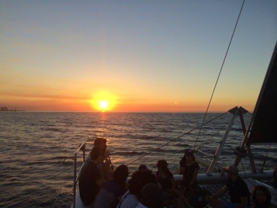 Na Boyes drive nad Muizenbergem vypukl v noci požár a díky větru přes 90 kilometrů za hodinu se rychle rozšířil na velkou plochu. Museli evakuovat spoustu lidí, shořely nějaké domy, pořád zasahovali hasiči a lítaly vrtulníky s vodou. Taková škoda. Kolem páté jsme se vyzbrojili větrovkami a na čtvrtý pokus jeli do přístavu na plavbu katamaránem. Konečně! Nefoukalo, vedro bylo, takže jsme v půl sedmé vypluli kolem pobřeží vstříc západu slunce. On je to takový kýč, ale pak když je člověk na vodě a je to ticho a pomalá muzika, pluli jsme jen na plachty, parta lidí seděla celou dobu vepředu a pili jedny bublinky za druhýma a my vzadu měli skvělý výhled a hodně místa na focení. Západ slunce na moři je vždycky nádhera a v duchu jsem děkovala za tuhle úžasnou dovolenou. V osm už byla tma a čas na poslední večeři. Tak ještě jednou to skvělé sushi, prosím :-).