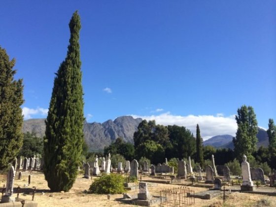 Takže jsme zaparkovali a šli se podívat na hugenotský památník v krásném parčíku plném růží, prošli nádherný, lehce zanedbaný hřbitov a pak popojeli do centra. Franschhoek má skvělou atmosféru, moc se nám tam líbilo a prošli jsme snad všechny restaurace, abychom se shodli, že si zasloužíme kus masa v té první prohlédnuté. Já hovězí, Honza rybu. Hlavně po belgické čokoládě, kterou jsme ochutnali v místním specializovaném obchůdku. Když jsme si na malém náměstí s výhledem na kopce sedli, pokukovali jsme, co jedí ostatní. Vedle u stolu přinesli jedné paní nádherné plátky krvavě udělaného hovězího, mačkané brambory a zeleninu, vypadalo to skvostně. Pán měl flák masa s nějakou omáčkou. Snažila jsem se to vyluštit v lístku, ale nakonec jsem se zeptala číšníka, co že to má ta paní v oranžové bundě. Řekl mi hovězí steak na houbové omáčce. Honzův pstruh byl jednodušší. Nevím, moje angličtina je asi vážně hrozná. Řekla jsem „woman in orange jacket“. Dostala jsem to, co měl ten chlap. Ale i tak to bylo vynikající. Kolem sedmé jsme se vydali zpátky do Tokai a usnuli bez čtení. Tenhle den byl jeden z nejhezčích a mám z něj ty nejkrásnější fotky.