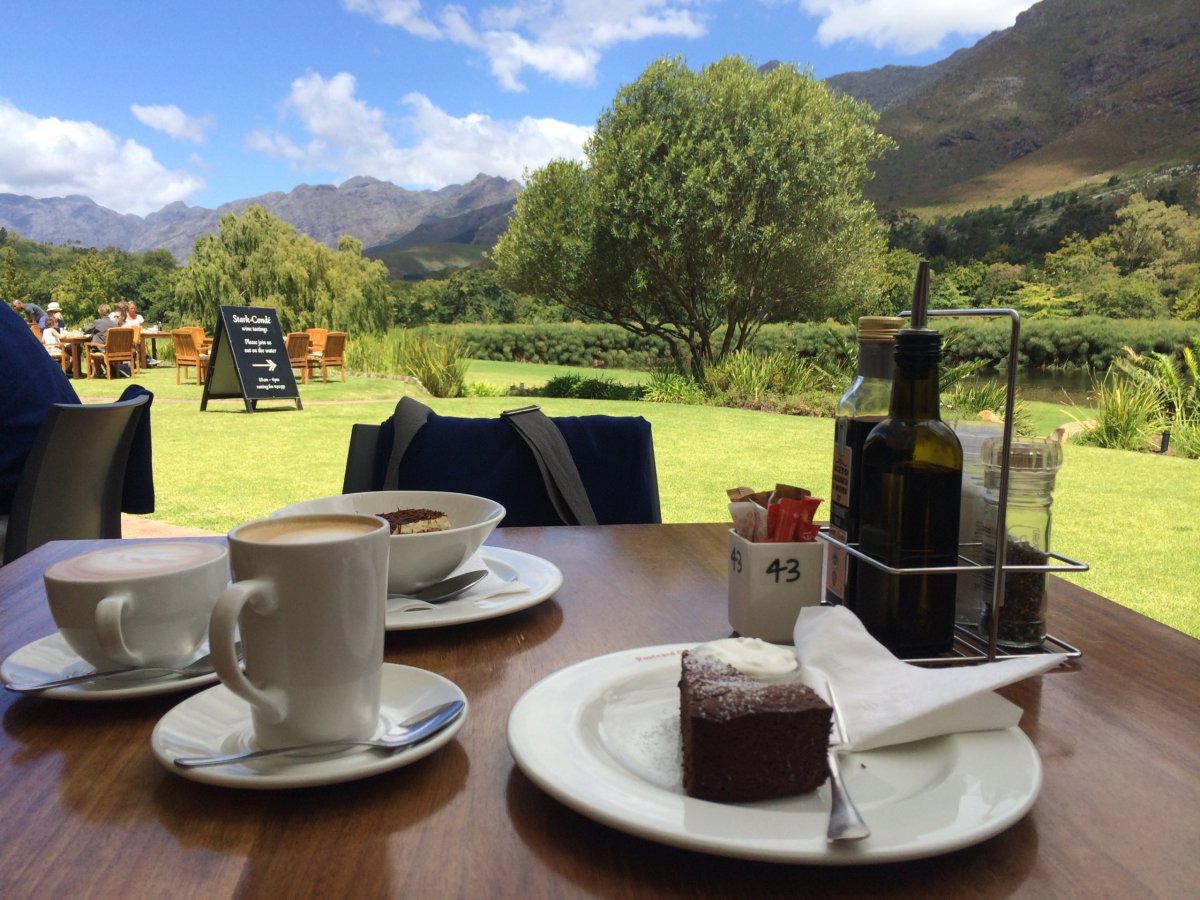 Honem pryč. Neodolala jsem a koupila pár kousků sushi a Honzovi rozinkovýho šneka, kde bylo těch rozinek asi deset deka. Chodili jsme po trzích asi hodinu, byla tam opravdu hezká atmosféra. Po poledni jsme přejeli kousek do městečka Stellenbosch. Průvodce i místní tvrdí, že je to nádherné městečko s pozůstatky holandských domků, nám přišlo celkem normální. Měla jsem adresu jedné směnárny, potřebovala jsem pro jistotu nějakou hotovost. Adresa z netu přesná, bohužel, místo Travelexu byl butik s hadrama. A v sobotu odpoledne už je všude zavřeno, v neděli jakbysmet. Courali jsme po ulicích, využili doporučené procházky z průvodce a nejdéle jsme zůstali v malém obchůdku s veteší. Hanka mi doporučila, že za městem, směrem do rezervace Jonkershoek je prý krásná kavárna Postcard café. Samozřejmě adresa nikde, když jsem si to doma googlila, našla jsem to, ale realita je vždycky jiná. Nakonec nám poradili cyklisti u závory do parku. Pár kilometrů jsme se vrátili a ocitli se skoro v ráji. To byla taková nádhera! Uprostřed vinic, na louce, u jezírka, krásné výhledy na okolní kopce, popíjeli jsme tam kafe snad hodinu, jak se nám odtamtud nechtělo a bylo to pro mě jedno z nejhezčích míst na dovolené.