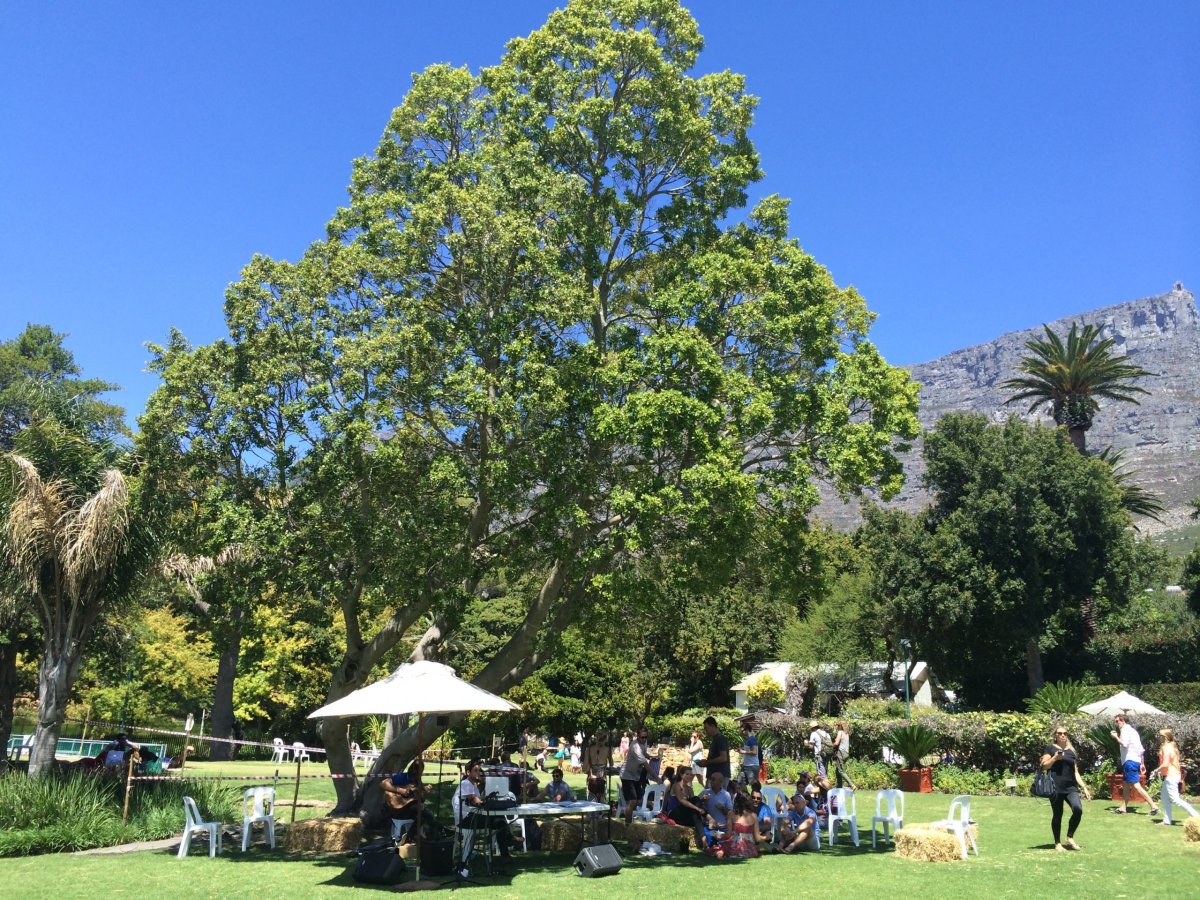 Zato se tam srotila skupina domorodců a začala nějaké rituální tance a zaříkávání Bylo by to hezké, kdyby se u stojících šamanů nepovalovaly jejich igelitky. V muzeu Honza ulovil další čepici, tentokrát vojenský jihoafrický baret. Hurá! Cesta kolem hlavního nádraží byla poněkud zapáchající a všimli jsme si, že autobusy jezdí opravdu jen místní. Výjimkou bylo pár statečných bílých batůžkářů. Bylo kolem jedné a Katrin nám poradila, že pod Stolovou horou v jedné zahradě bývají sobotní farmářské trhy a posezení, hraje tam kapela… tak jsme tam jeli. Dali jsme si k jídlu něco jako gyros a sedli si s ním do trávy a bylo to tam kouzelné. Sýry, sushi, ovocné džusy, jogurty, děti vřískaly u místního bazénku, ale ve dvě odpoledne už to pomalu končilo.