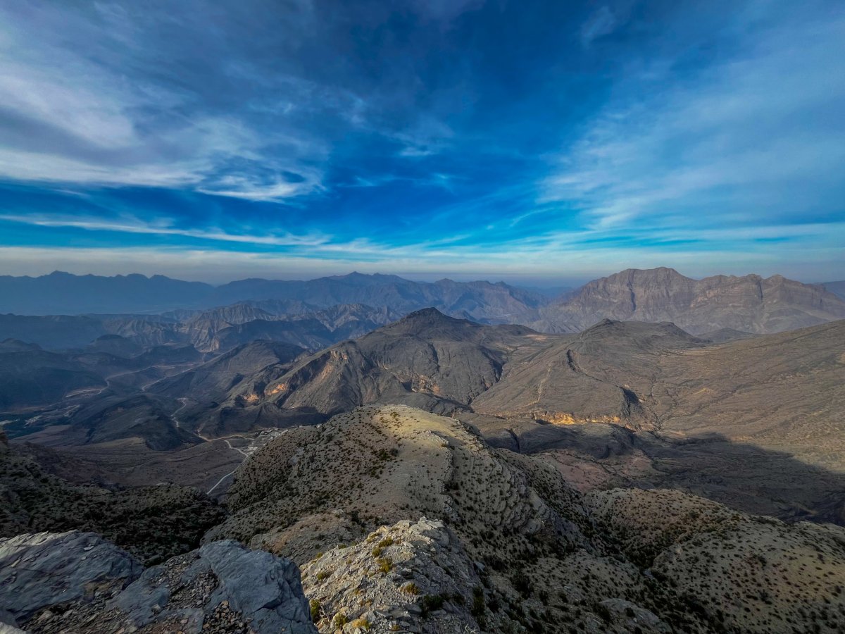 S přibývající nadmořskou výškou prolomujeme oblačnost a za odměnu se nám naskytnou nádherné výhledy. Grand Canyon je, zatím, schovaný pod mraky, ale ten pohled na nejvyšší ománské vrcholky obklopené bílou peřinou je vskutku skvostný a nejeden fotograf by se zde vyřádil. Následuje opět lehké klesání do již zmíněné vesnice, která je však znovu ve výšce na úrovni oblačnosti. Zaparkujeme, zkontrolujeme, zda všechny pneumatiky drží a vycházíme na trail.