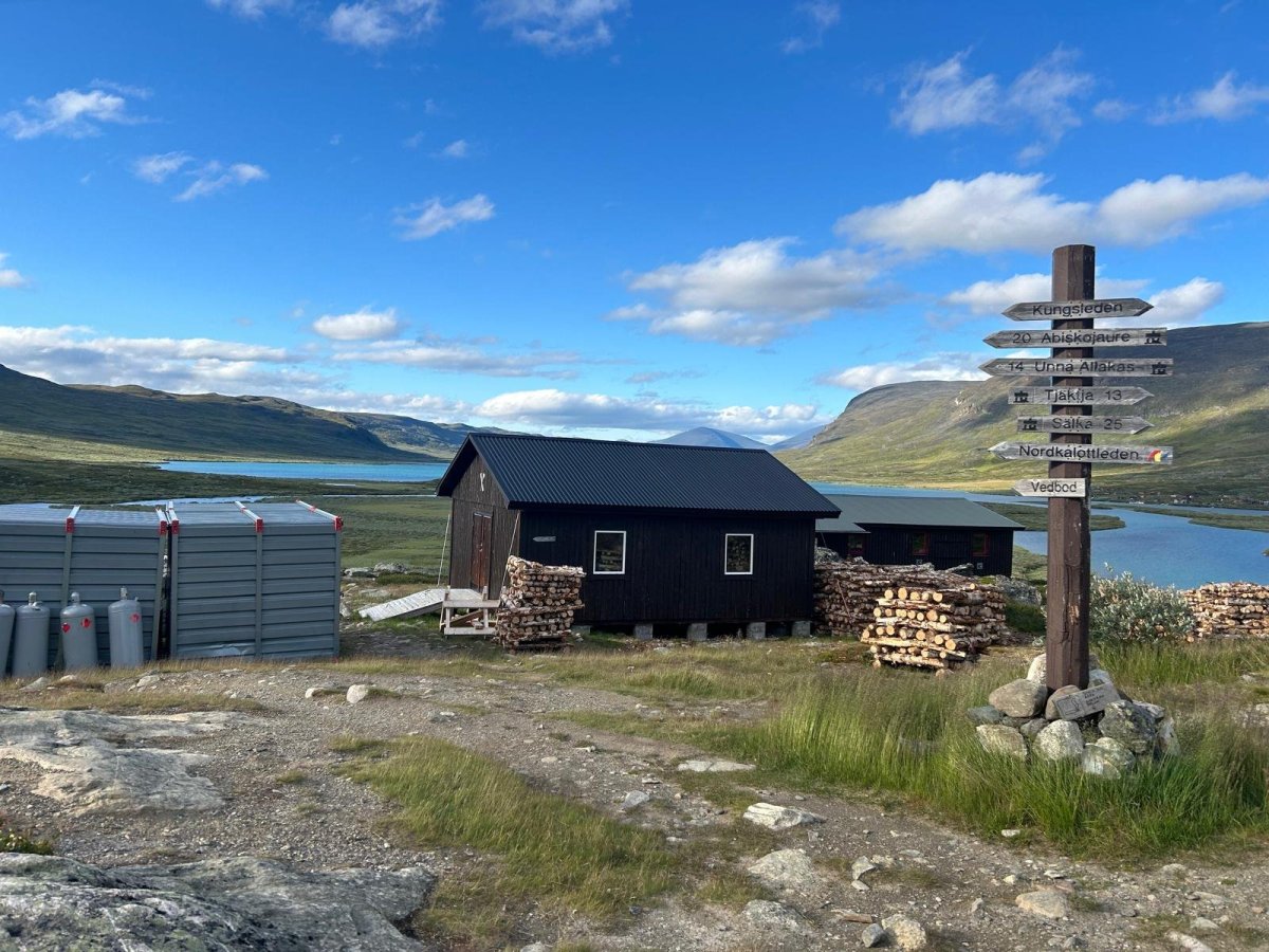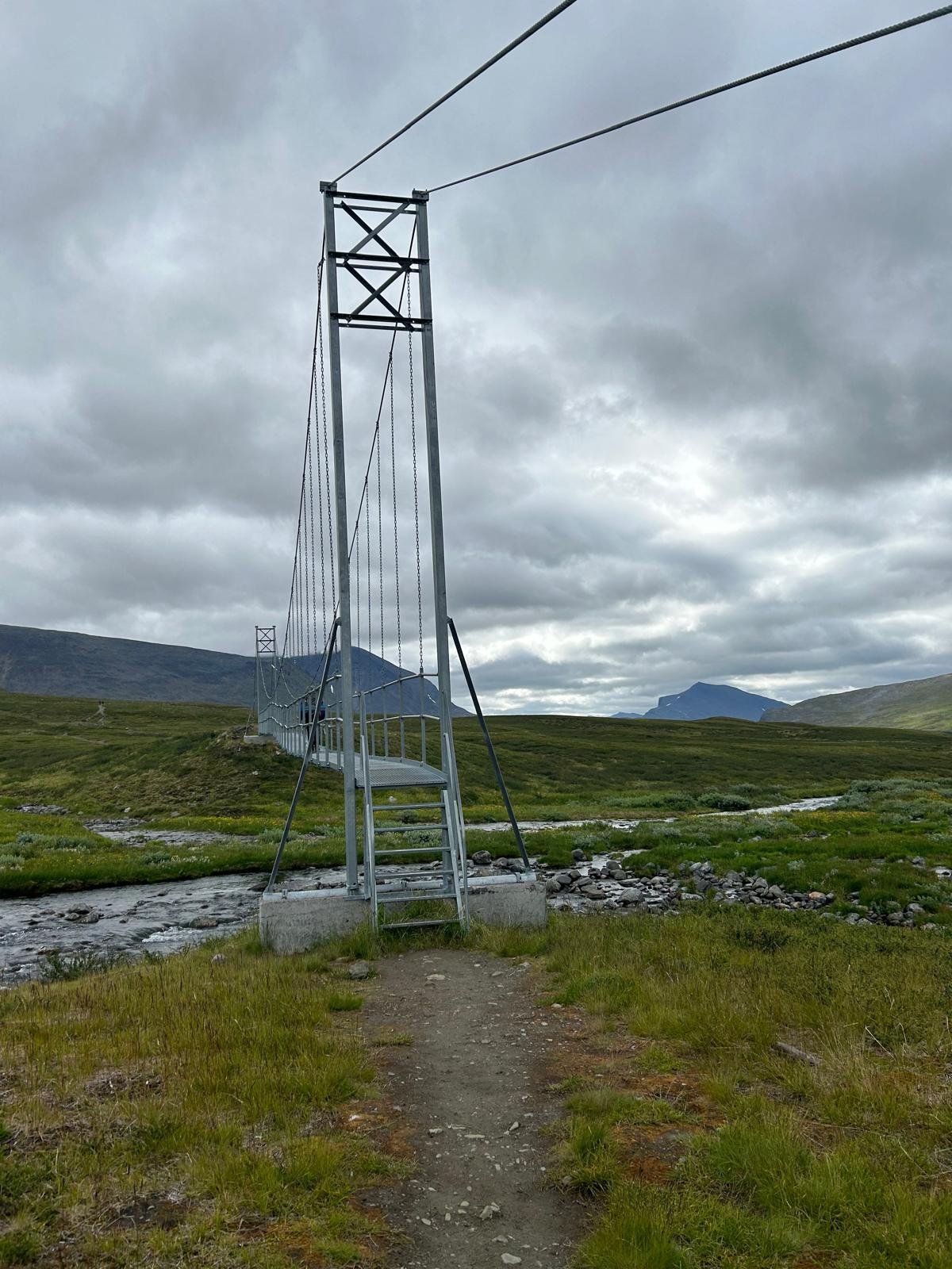 První etapa byla jednoduchá, šli jsme po dřevěných chodníčcích, kterým občas zkřížily cestu kameny. Šli jsme údolím podél řeky a z obou stran se tyčily vysoké hory. Byli jsme plní síly, a tak nám kilometry rychle ubíhaly. S několika krátkými přestávkami jsme kolem 21. hodiny dorazili k první chatě Abiskojaure Fjällstuga. Uvařili jsme si dehydratované jídlo a otevřeli si pivo, které jsme v chatě sehnali. K posezení venku ale nedošlo, roj komárů nás okamžitě zahnal do stanu, kde jsme záhy velmi rychle po 17hodinové cestě na sever a 15 kilometrech v nohách usnuli. Ani nám nevadilo, že sluníčko celou noc nezapadlo. Za postavení u stanu jsme zaplatili při kurzu 2,2 koruny 600 SEK, pivo nás stálo 60 SEK.