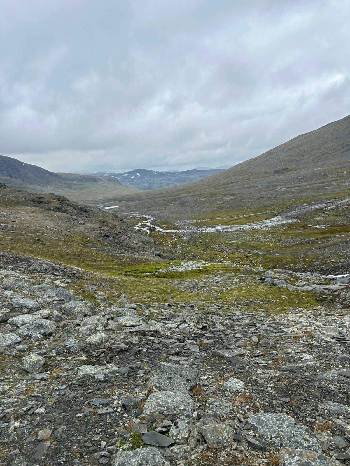 Probudili jsme se do mraků, ale nezbývalo nám než sbalit stan a vydat se na druhou 20 kilometrovou etapu k STF Alesjaure Mountain cabin. Nechtěli jsme již platit poplatek chatě, a jelikož se dá tedy ve Švédsku mimo národní parky stanovat kdekoli, měli jsme v plánu utábořit se kousek od chaty, kde bylo alespoň nějaké zázemí pro případ špatného počasí.