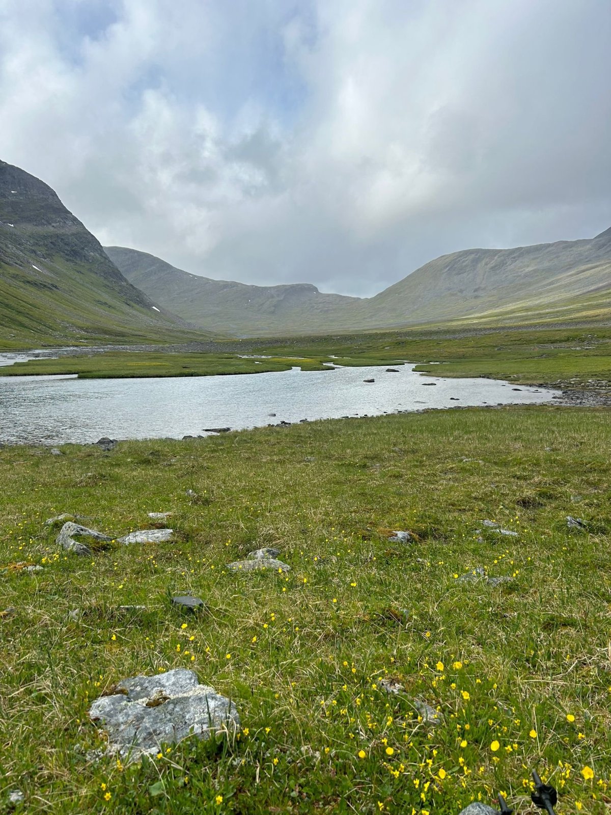Po zdolání sedla nás čekalo ještě devět kilometrů k chatě. Devět kilometrů té nejkrásnější přírody, sobů, potůčků, ptáků, no prostě nádhera. Večer jsme jen zvládli postavit stan a zcela vyčerpaní jsme okamžitě usnuli.