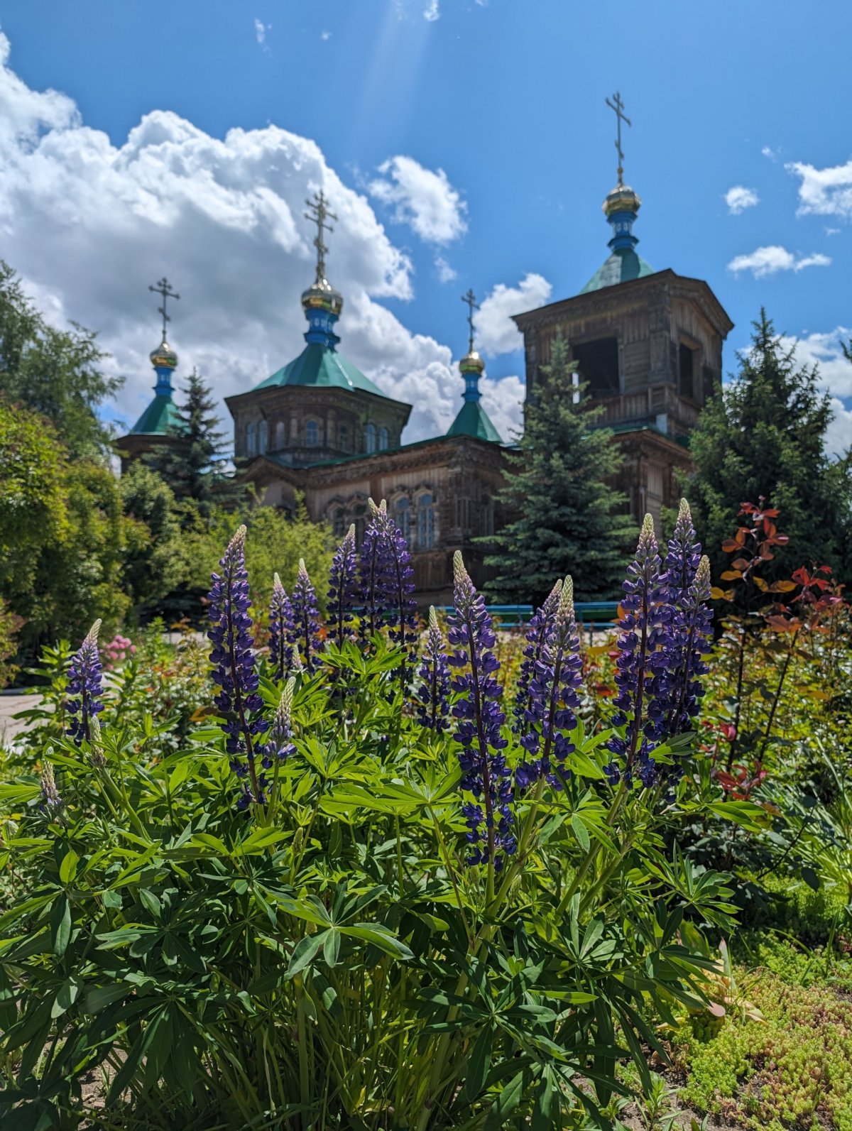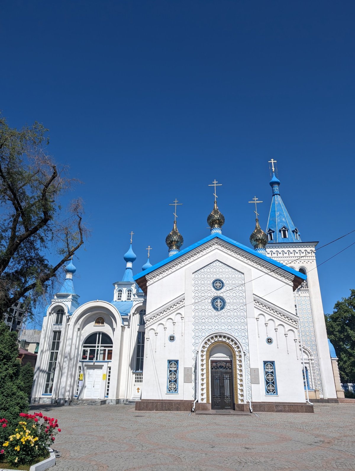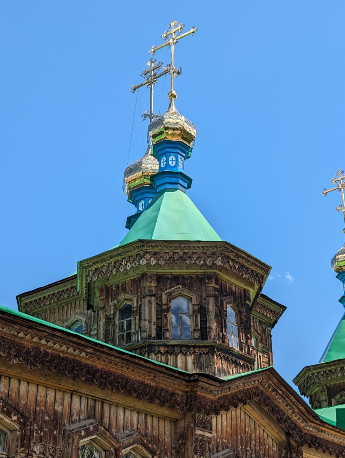 Zpět mi staví taxikář v autě bez klik, ale za to za 100 SOM na 20 km. Doveze mě na křižovatku s hlavním tahem do Karakolu. Ihned mi staví další řidič, který mě odveze až do centra Karakolu za 200 SOM. Zde si prohlédnu dřevěný kostel, kde jsou opět strážci gringo žebráci.