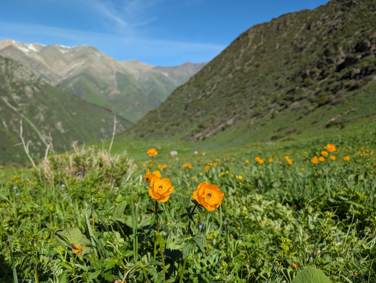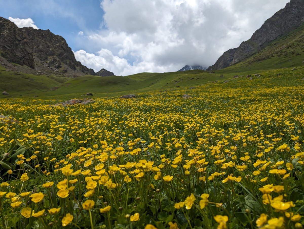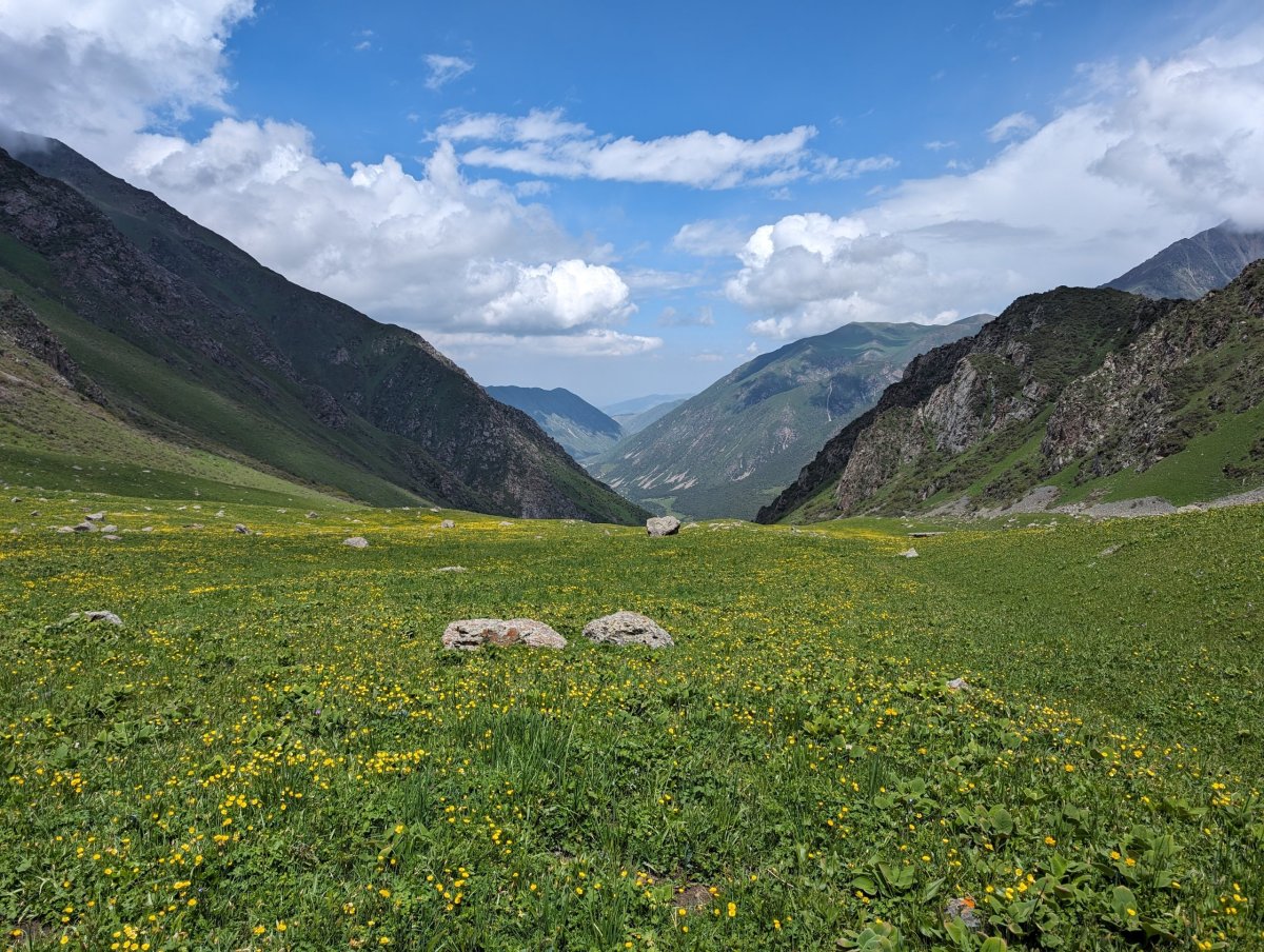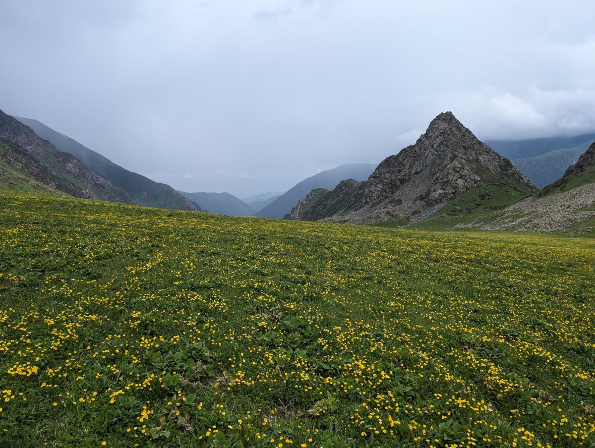 Počasí hlásilo déšť na 12 hodinu. Dostávám se o 800 výškových (na 4 kilometrech) metrů a začínají padat malé krupky. Teplota klesá. S rostoucím vertikálním gradientem se rychle mění struktura vegetace. Po třetím překročení říčky mě přivítala louka plná rozkvetlých žlutých blatouchů a svišťů bonzáků. Na rozdíl od Ala Archa se zde svišti báli a zdrhali, když mě zahlédli na 200 metrů. Připadal jsem si jako na louce Teletubbies.
