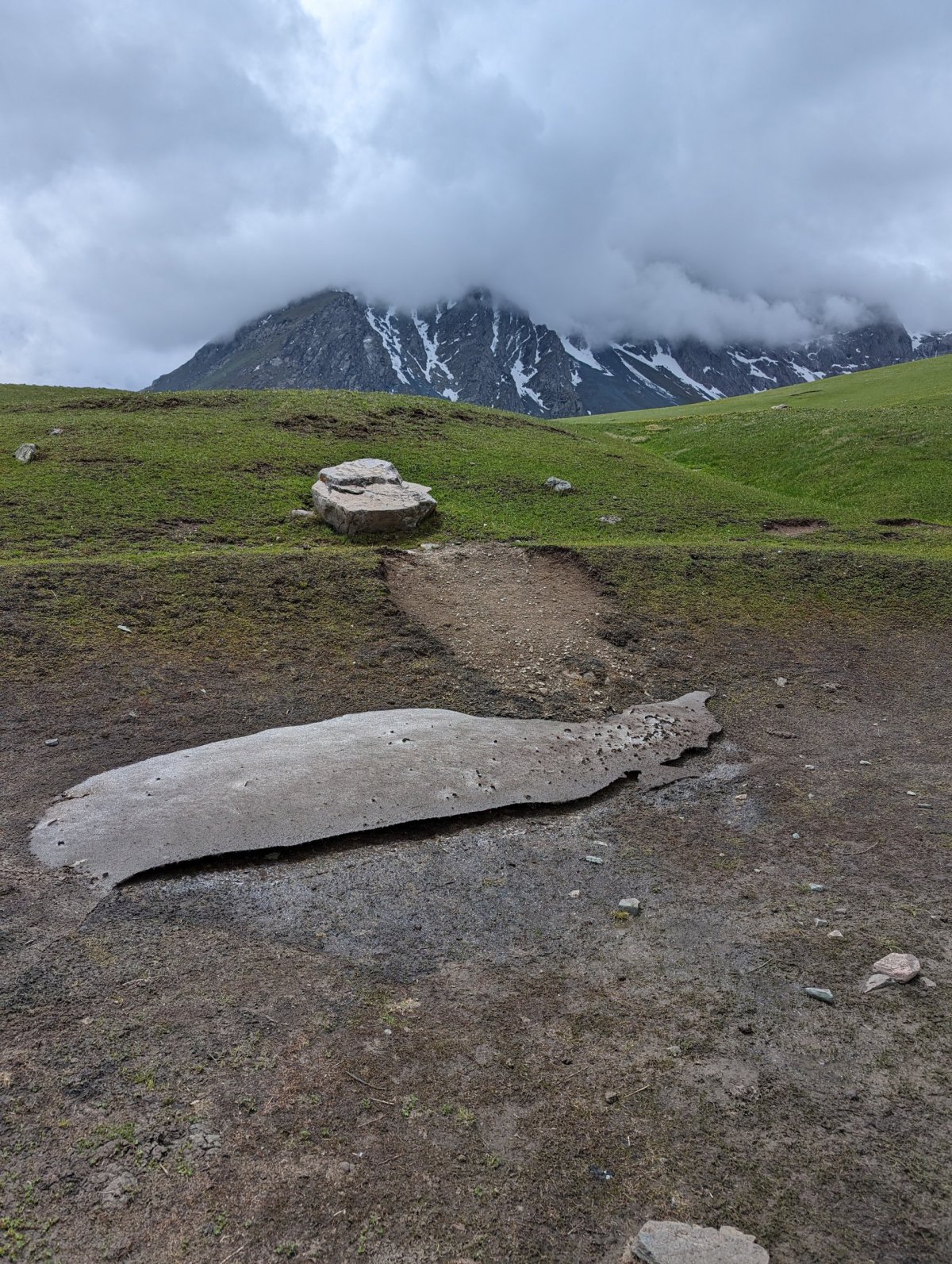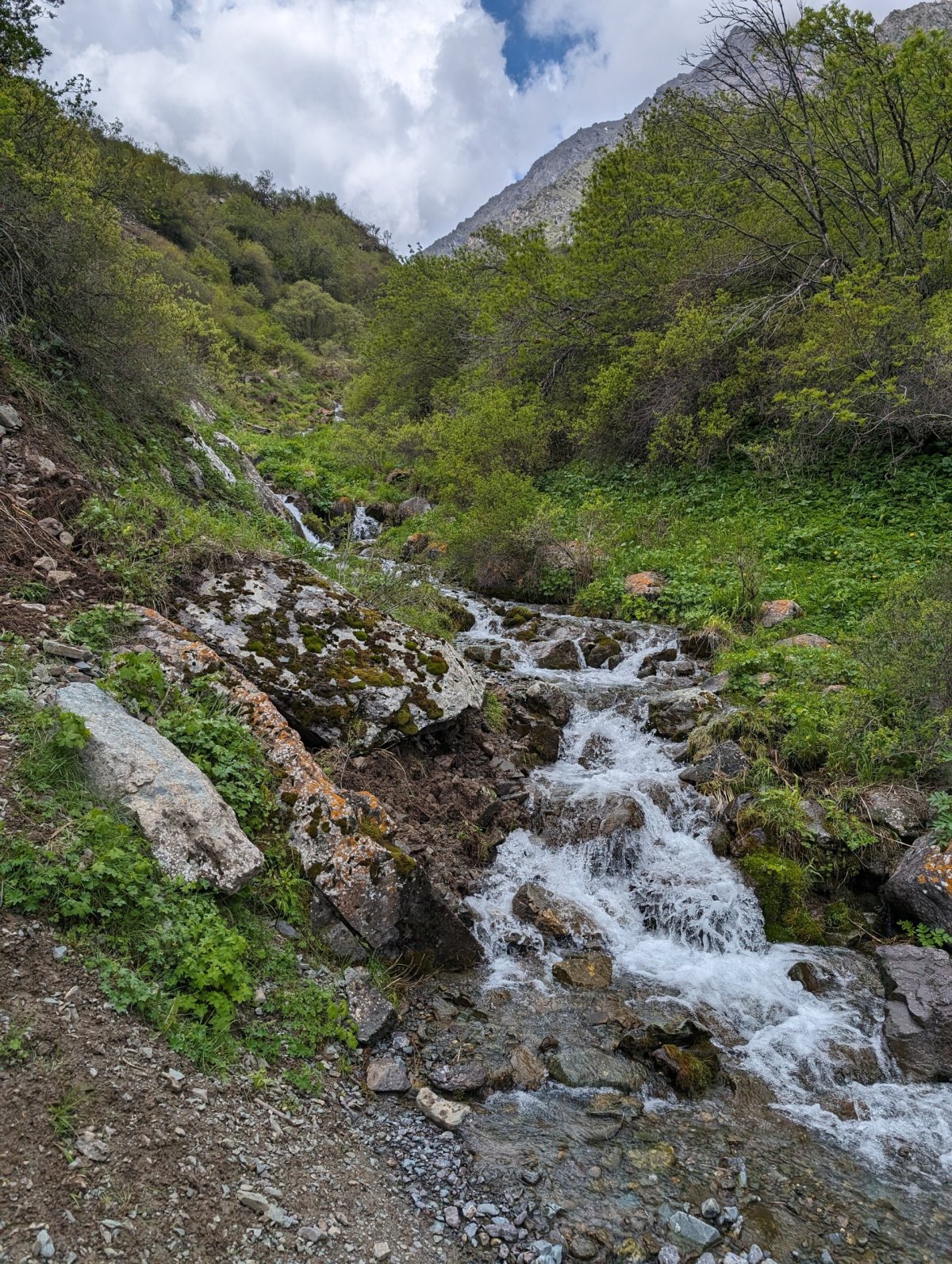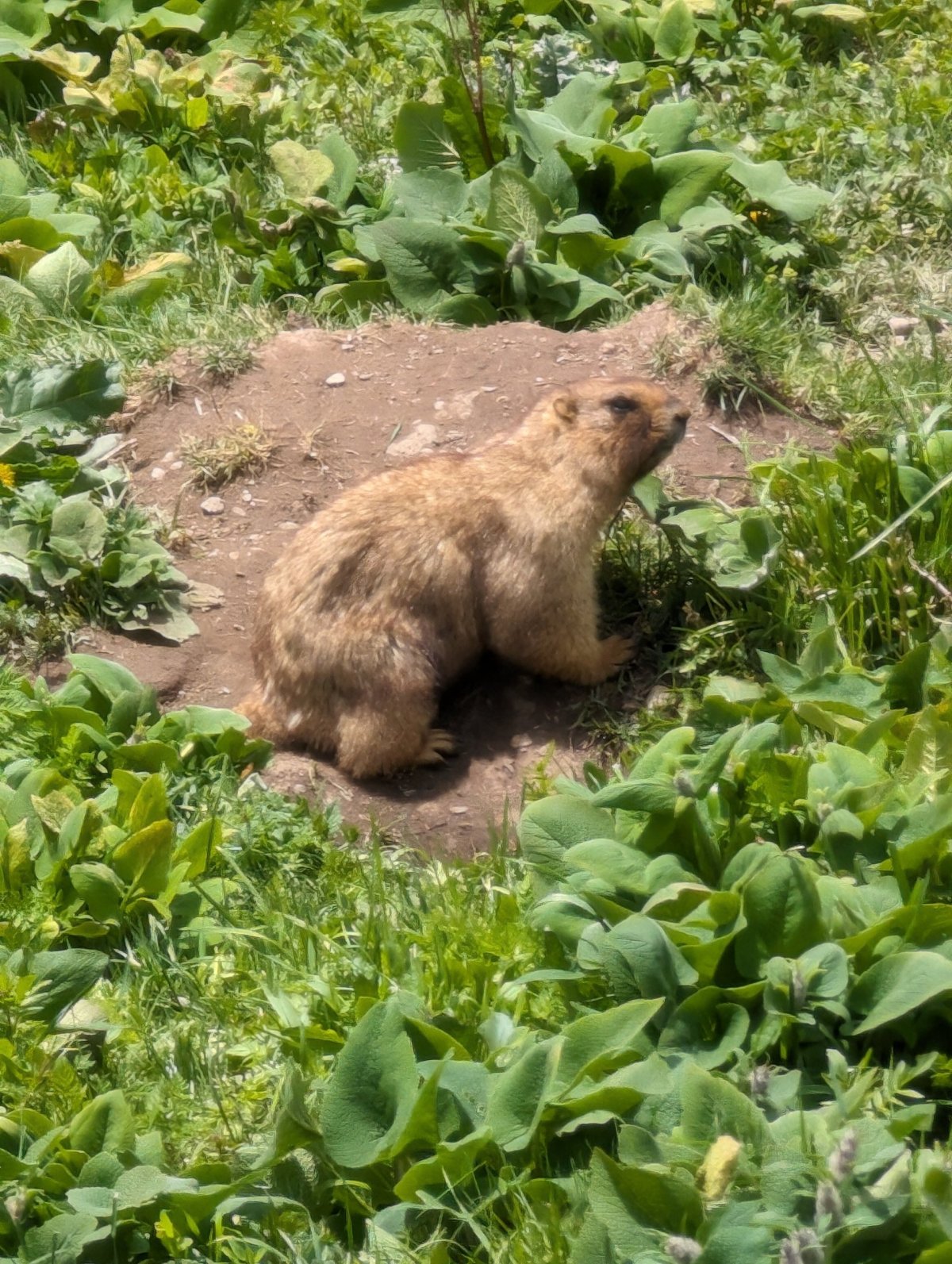 Počasí hlásilo déšť na 12 hodinu. Dostávám se o 800 výškových (na 4 kilometrech) metrů a začínají padat malé krupky. Teplota klesá. S rostoucím vertikálním gradientem se rychle mění struktura vegetace. Po třetím překročení říčky mě přivítala louka plná rozkvetlých žlutých blatouchů a svišťů bonzáků. Na rozdíl od Ala Archa se zde svišti báli a zdrhali, když mě zahlédli na 200 metrů. Připadal jsem si jako na louce Teletubbies.