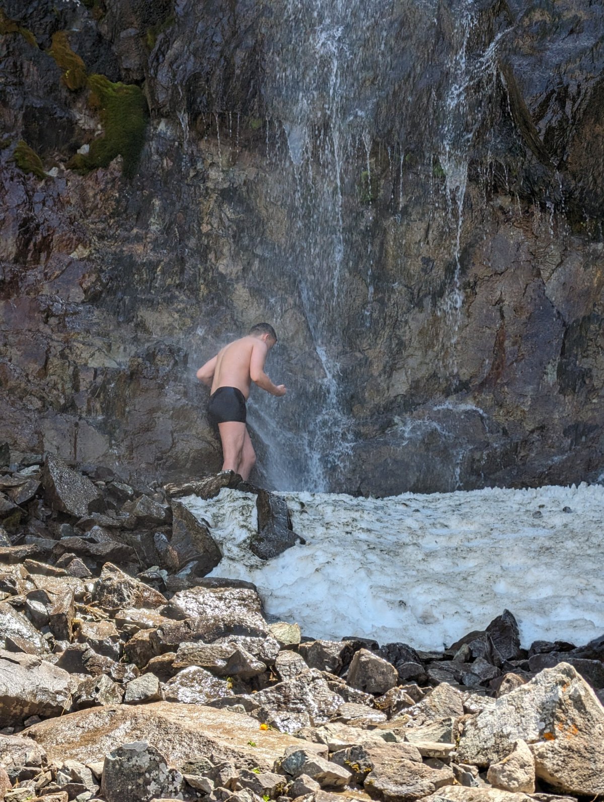 Pod vodopád není kde zabloudit. Následuje base Camp kde se dá jít rovně na chatu Racek nebo doleva k vodopádu. Já si chtěl první den vystoupat jen na 3000 metrů a zbytečně neblbnout. Jsem prostě cestofilcka. Cestou zpět jsem si to zkrátil přes kamenné pole k vodopádu. Zde si místní Maladěc umýval záda jak doma pod sprchou. Sníh pod vodopádem reprezentuje teplotu vody.