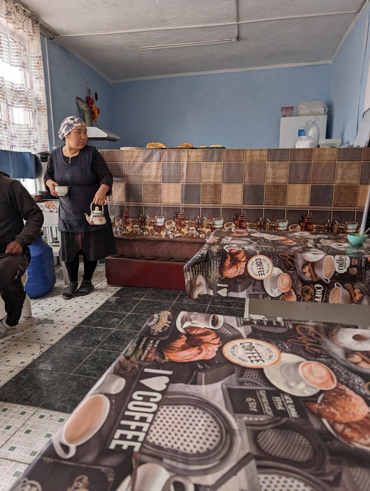 Vcházím do místní jídelny a cítím se, jak v pařížské kavárně. Dekorace Vás pohltí. Obsluhu, kuchařku a vše ostatní dělá žena se zlatým srdcem i zlatým úsměvem. Nevím však, co si mohu objednat. Proto do Deepl nahraji: "Mám hlad a žízeň, co mi můžete nabídnout?" U sousedního stolu seděli řemeslníci. Otázku pochopili nějak jinak a mysleli si, že nevím co pijou. Tak mi ji hned naléval ať ochutnám, což jsem s úsměvem odmítl. Jenže situace se vyvinula, že mi řemeslník šel pepsi koupit do sámošky a donesl. Nechal mi ji na stole a odešel. Zřejmě jsem vypadal, jako největší chudák v okolí. Díky za ty milodary.