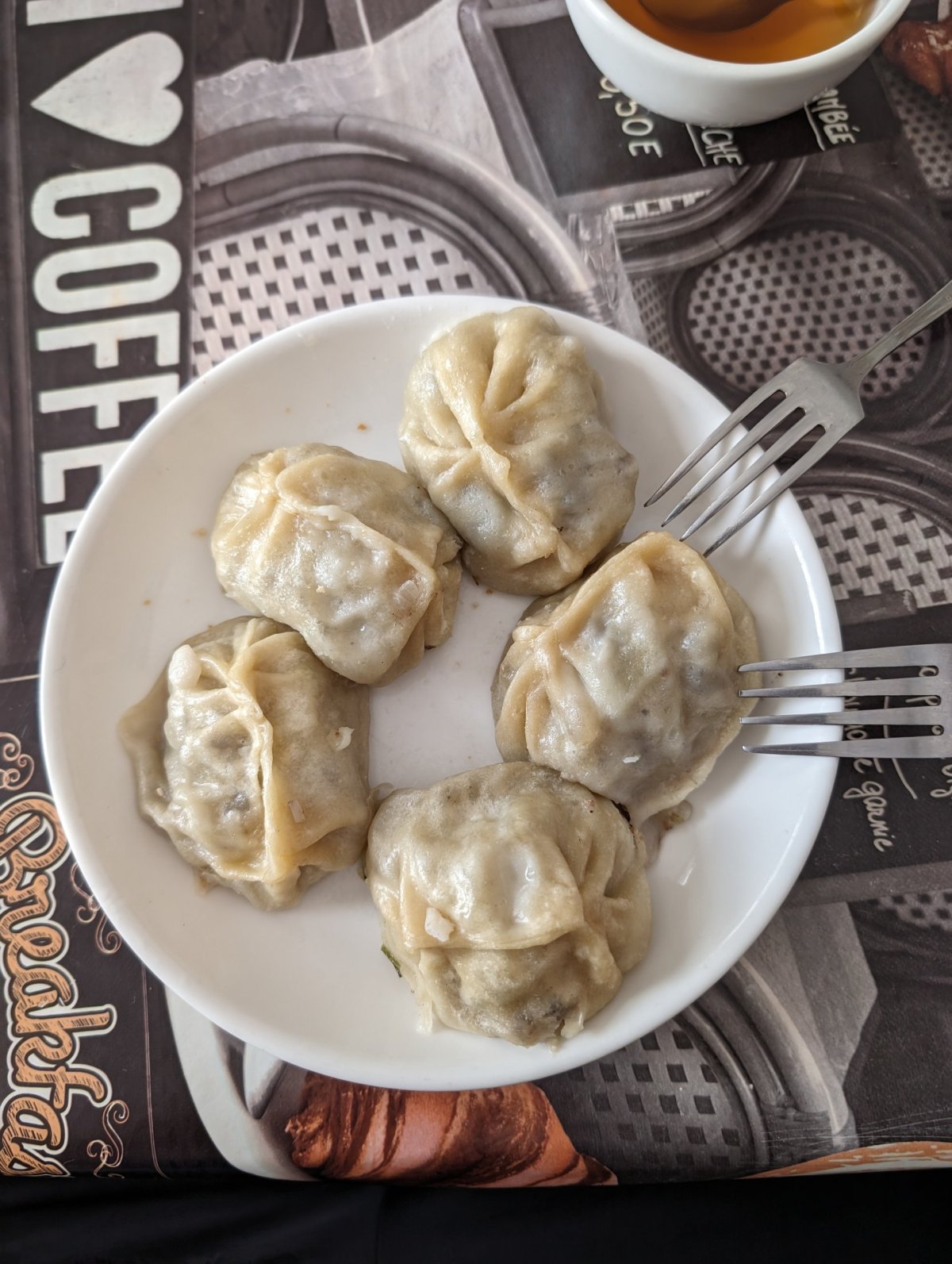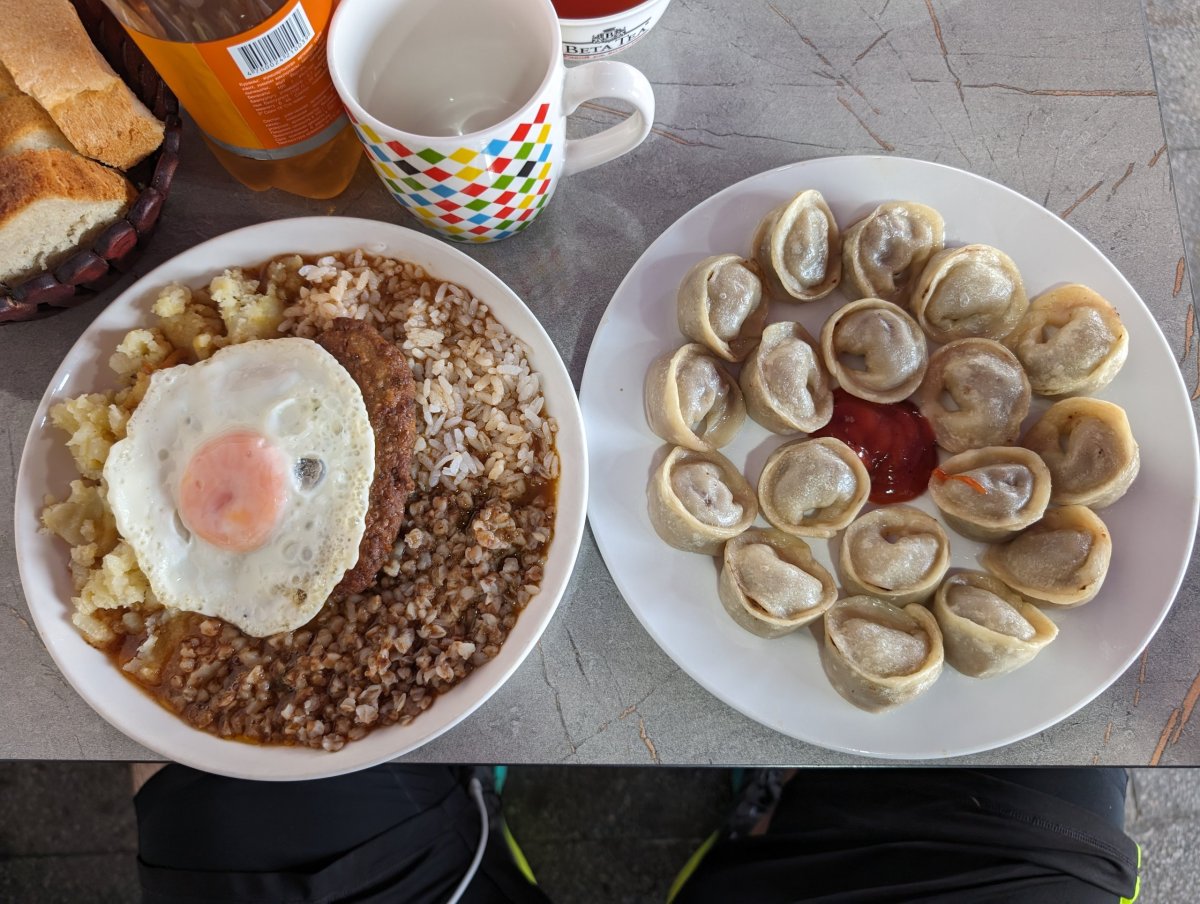 Paní začala zvedat poklice a ukazovat co má. Objednal jsem si Pelmeně s masem. Byly naprosto vynikající. K pití dostávám čaj (pivo z tanku bohužel nemají) a na dojedení ještě pečivo se stejnou masovou náplní. Cena 300 SOM.