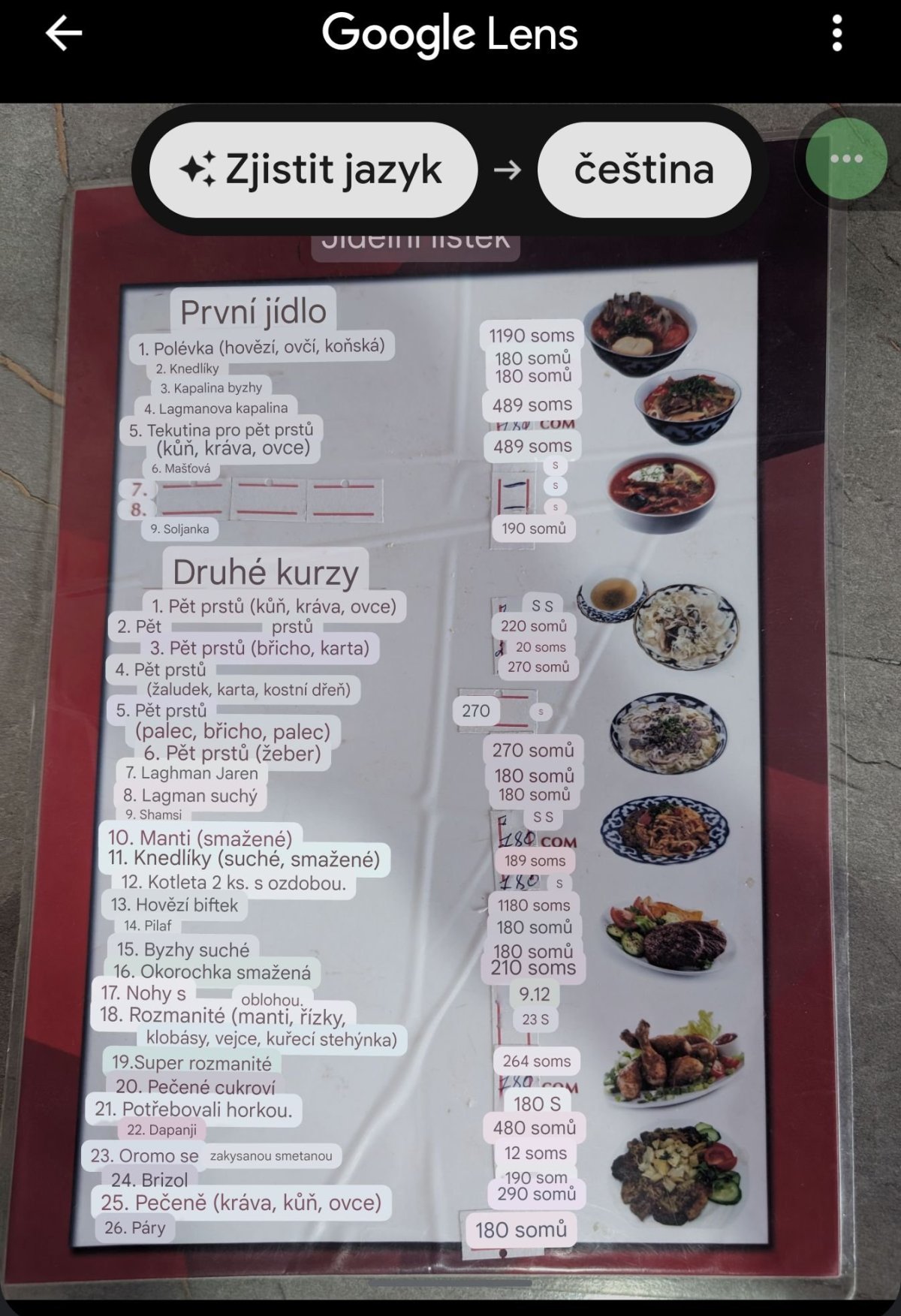 U vstupu do restaurace/jídelny je často umyvadlo, kde si můžete umýt ruce. Uvítal bych to i u nás. Jídelní lístek jsem si přeložil v google lens (4 a 21 vypadá lákavě). Nakonec jsem zvolil pelmeně, biftek, čaj a limonádu. Cena 450 SOM.
