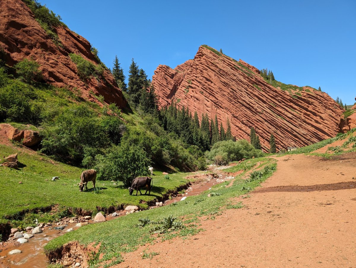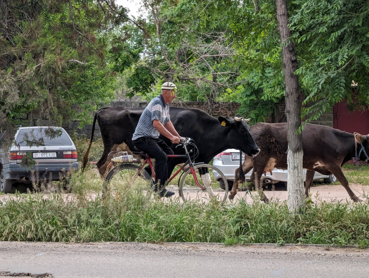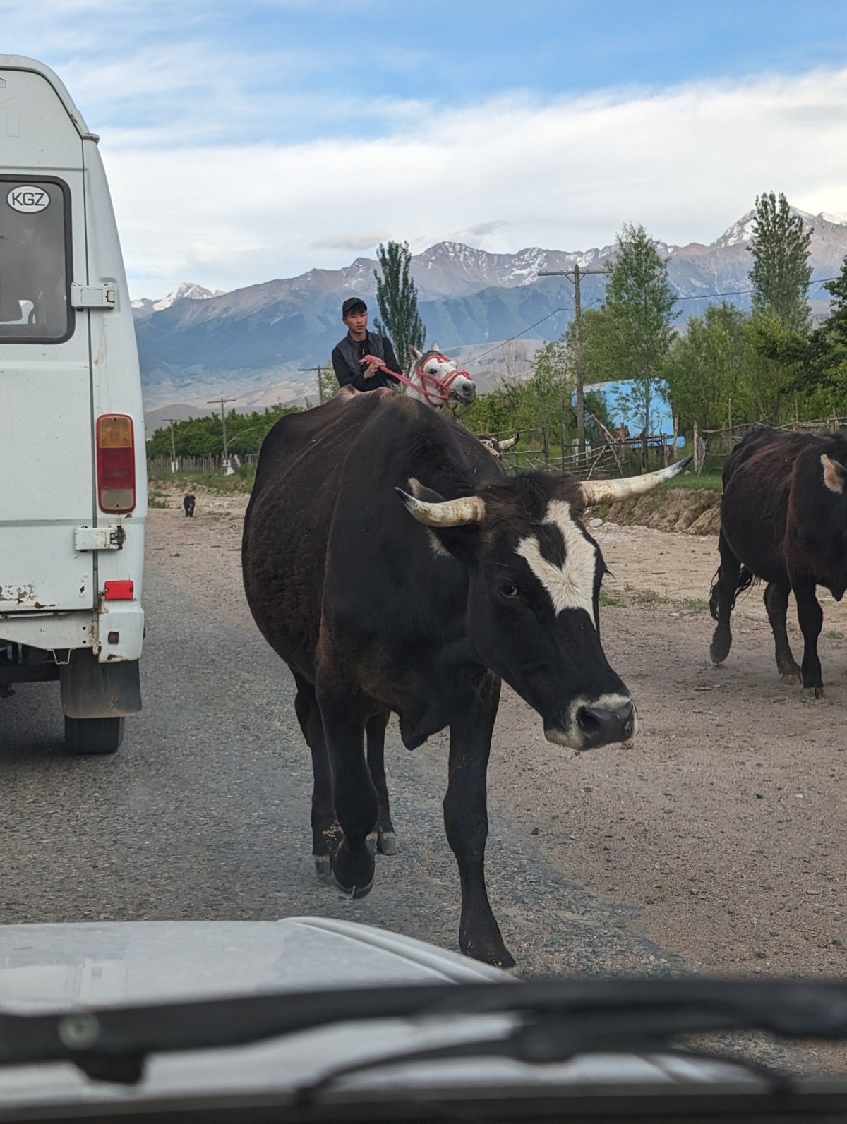 Den začal dohadováním s taxikáři na ceně. Chtěl jsem vyjet až na horské sedlo do 3800 m. n. m a zpět. Cena byla absurdně vysoká 5000 SOM. Na to jsem nekývl a na smlouvání neslyšeli. Pojedu jen k vodopádu. Cena 1500, pak 1000 a za rohem jsem sehnal dědu za 600 SOM. Vzdálenost 20 km a jízda skrz několik stád dobytka. Několikrát auto nakopne kráva, tak se nelekněte.