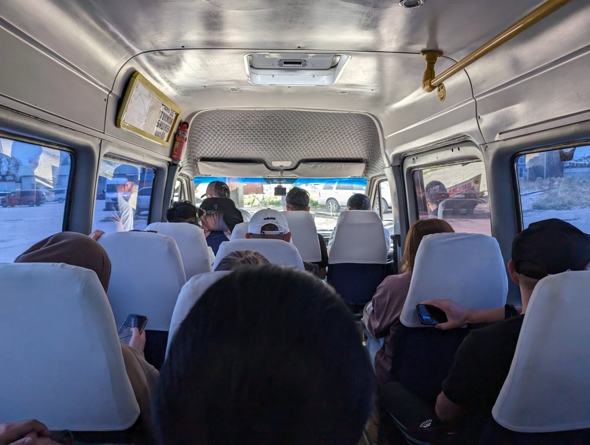 Místní lidé zde stávají výrazně po slepicích. Vyrazit na cestu brzy nemělo moc význam. Proto startuji v 8 a hned první vůz obrovské SUV bez prasklého skla mě bere na křižovatku cesty Biškek Karakol. Po 50 minutách a tuctu projetých aut mi staví maršutka s nápisem Biškek. Usmálo se štěstí a je v něm i místo na sezení u únikového východu. Vyhrál jsem klenot. Člověk zde má místa, jako markrabě. Dokonce i menší vedro, než v poslední řadě. Cena opět 500 SOM, jako při cestě sem.