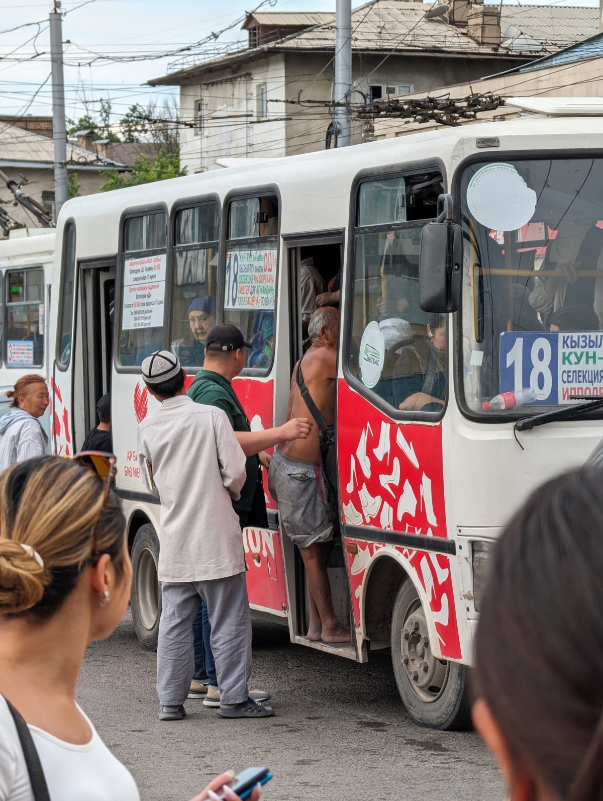 Opouštím ubytování v Biškeku a vydávám se směr Barskoon (jižní strana jezera Issyk-Kul). Nemám domluvené na tuty ubytování a nenašel jsem, jak se tam dopravím. Připravil jsem si stopovací ceduli. Odjíždím taxi na západní autobusové nádraží. Cena za 20 minut jízdy 200 SOM. Teplota na palubní desce šoféra hlásila 55 stupňů. Na osm hodin ráno pohoda.