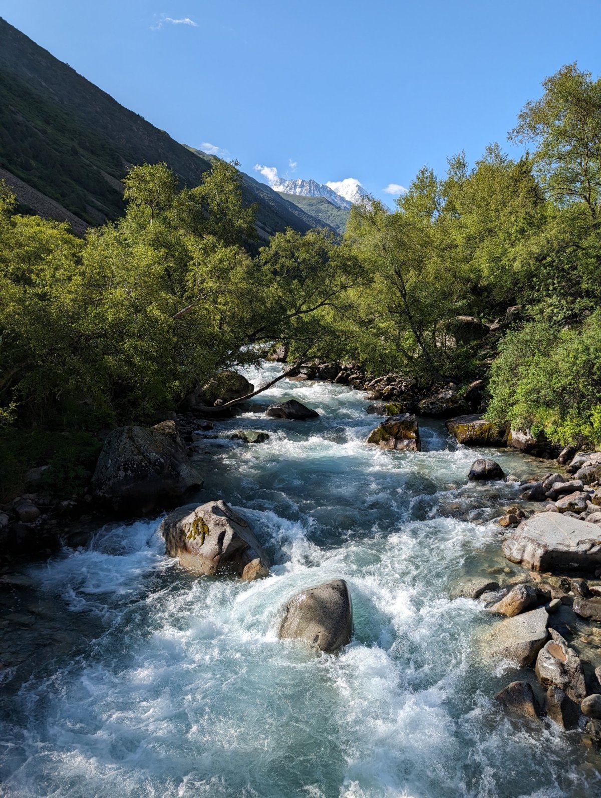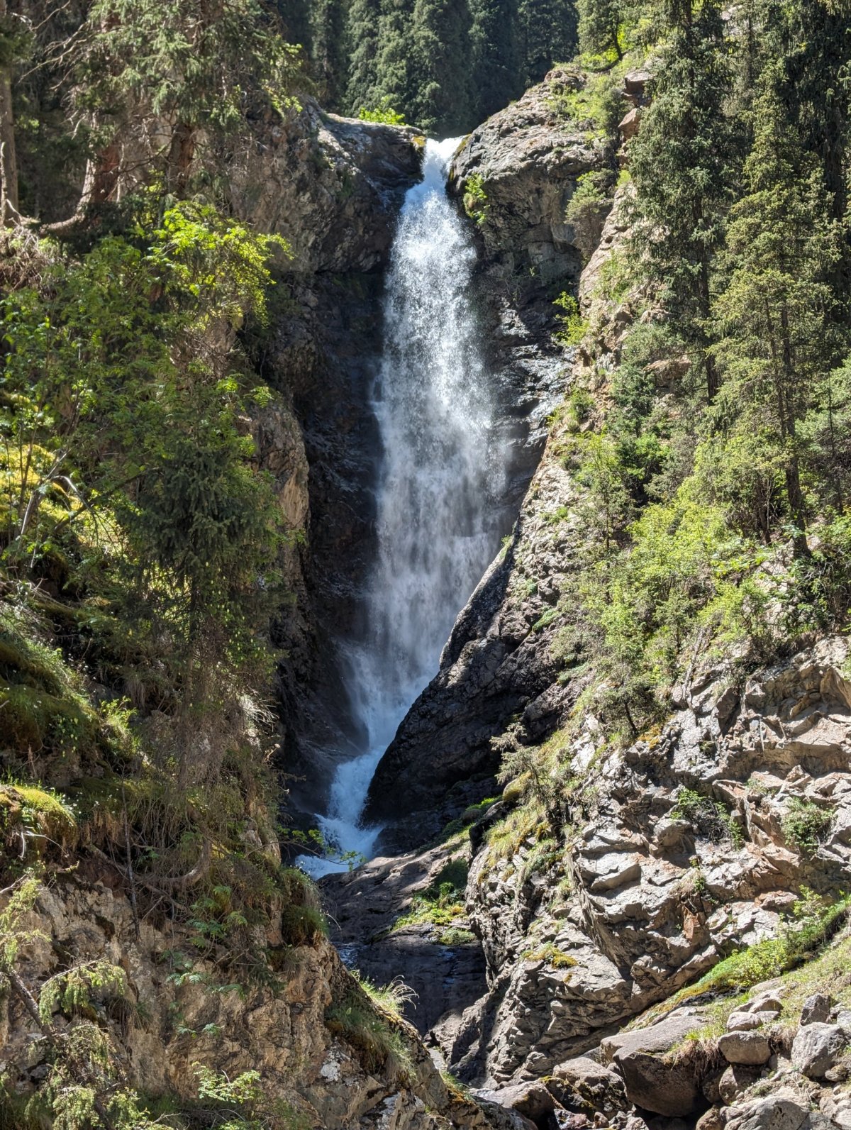 Odsud stačí jen přejít most a člověk se ocitne ve švýcarské pohádce. Cesta vede nad korytem řeky, která protéká údolím. Po cestě potkám stádo koní a vyhýbám se kravám na výletě. Stezka je značená viditelnými cedulemi. Nedá se zabloudit. Zhruba po 5 km proti proudu se dostanu pod vodopád, ke kterému jde vidět hůře turistická cedule. Je od cedule číslo šest zhruba 100 stupňů doprava. Po přebrodění ledového potoka se dostanete přímo pod vodopád.