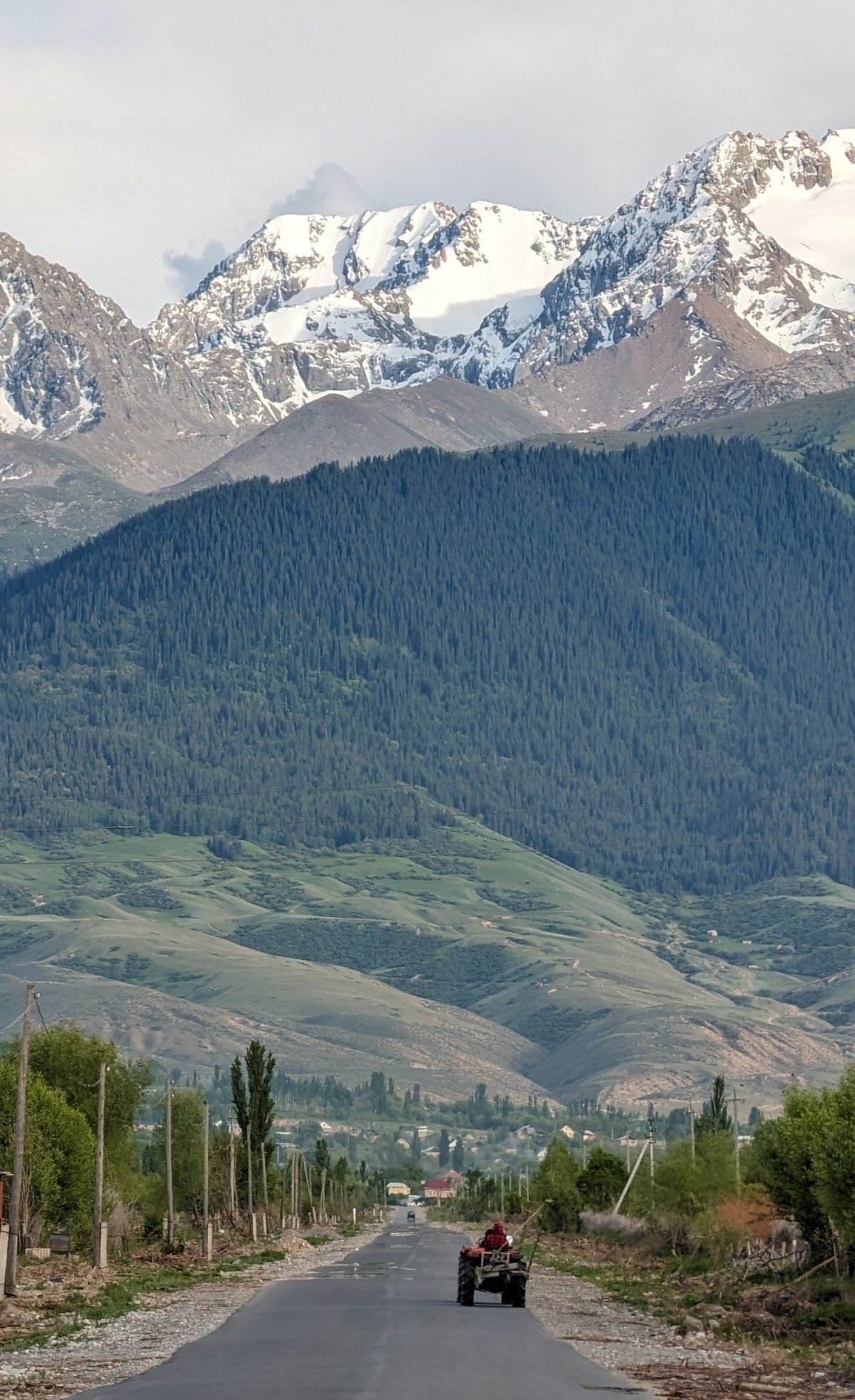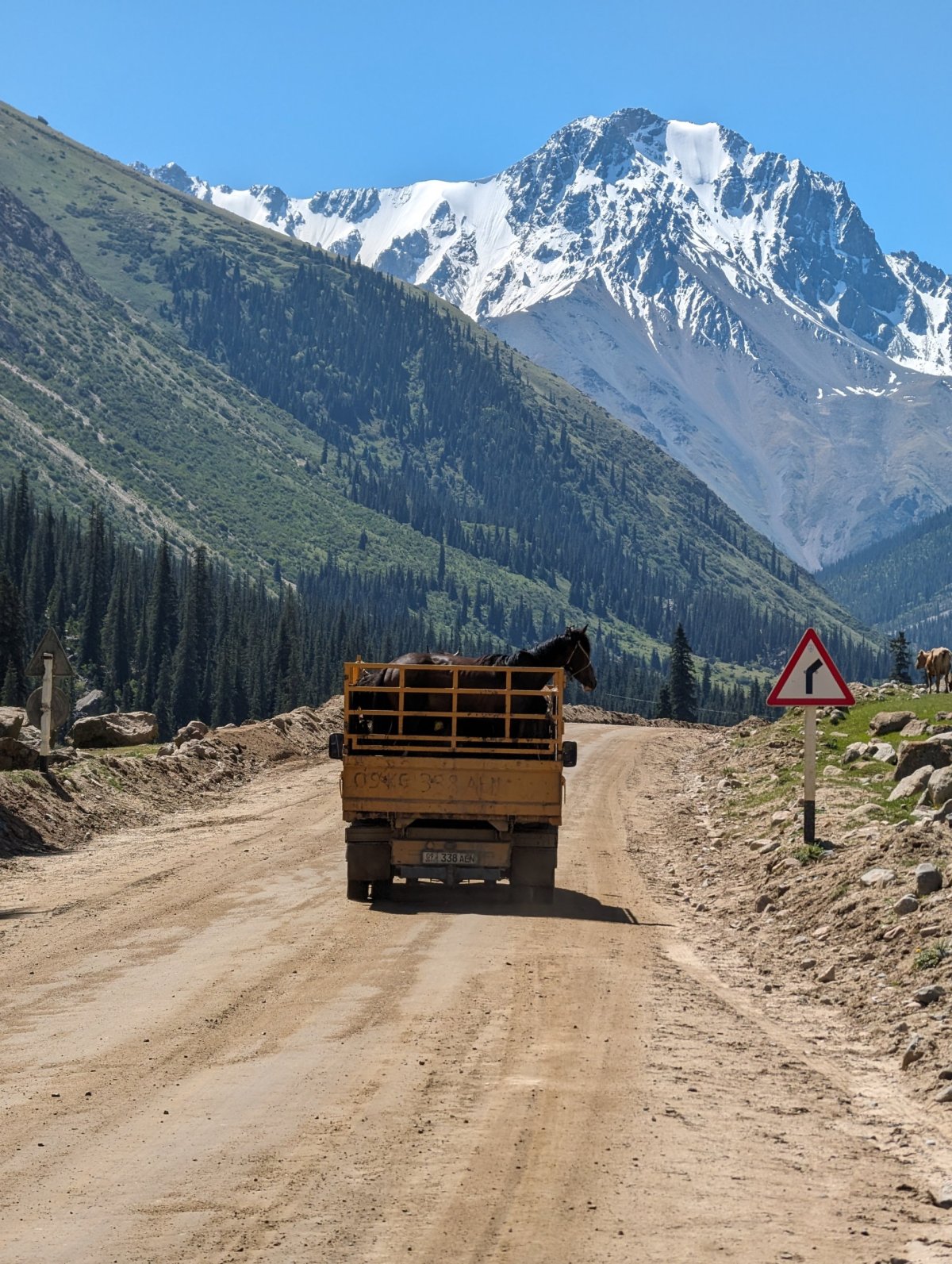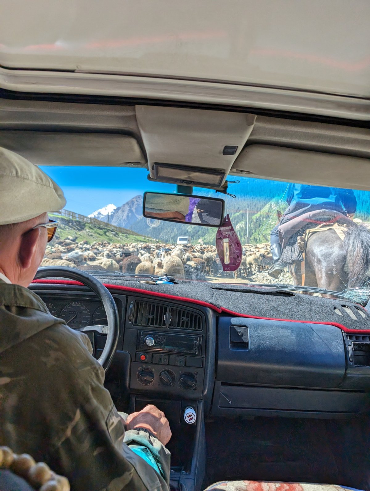 Druhým stopem mě veze místní Emerson Fittipaldi. Po děravé silnici jede 120 bez potíží s telefonem u ucha. Nabírá ještě dvě náhodné babušky. Je to zde běžné, že lidi stojí u silnice a potřebují odvést do Karakolu. Rychlejší varianta, něž čekat na maršutku.