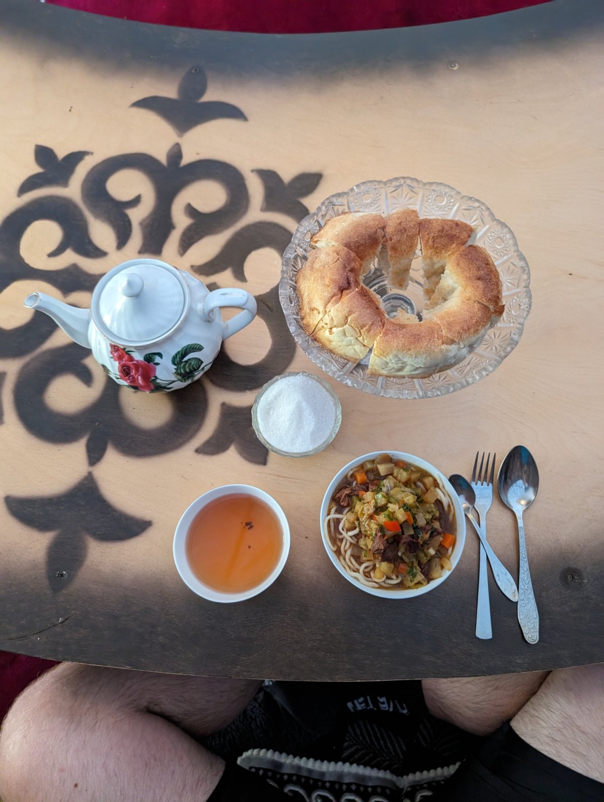 Oběd si dám u místních v Jurtě. Krásné prostředí a výborná polévka Laghman. Cena 300 SOM.