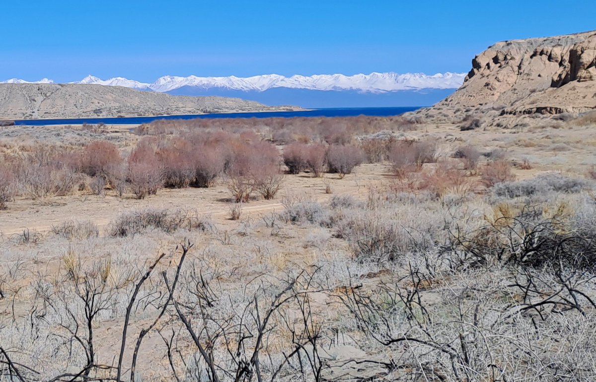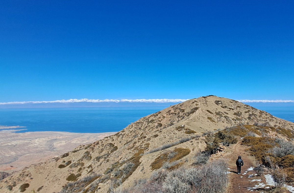 Výlet na Shatyly - výhled na jezero. Na tenhle výlet je lepší taxi, je to v horách, příliš malý provoz na stopování. Krátká hezká procházka na kopec, ze kterého lze vidět celou šíři Issyk Kulu. Max 2 hodiny. Taxi 400Kč.