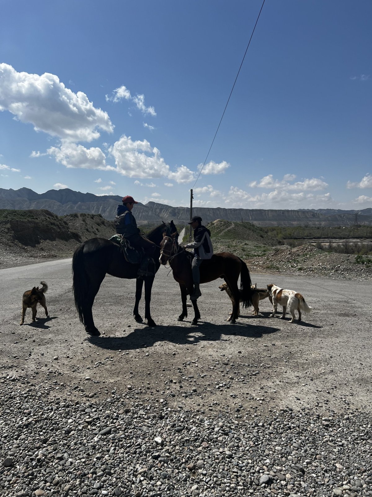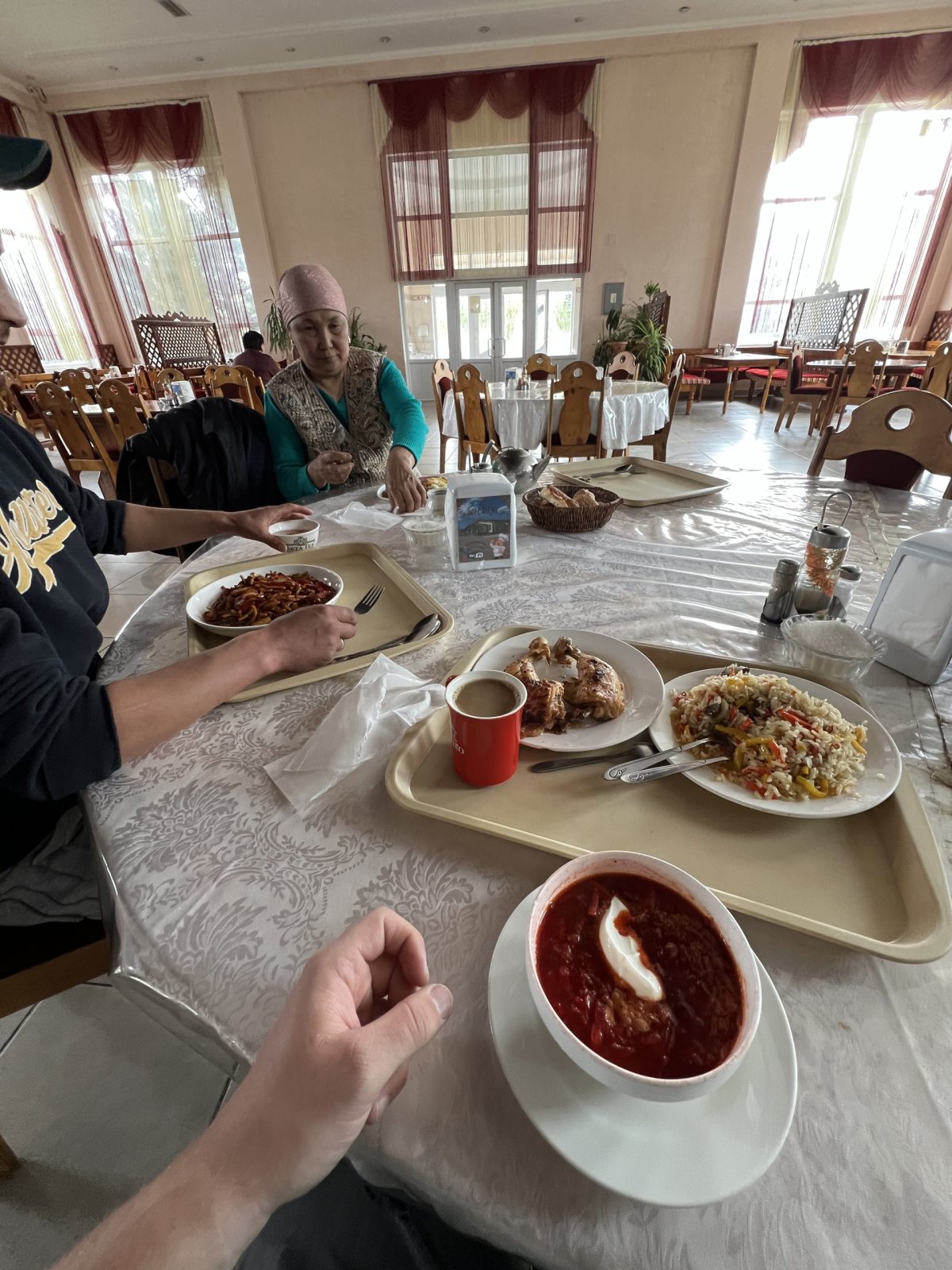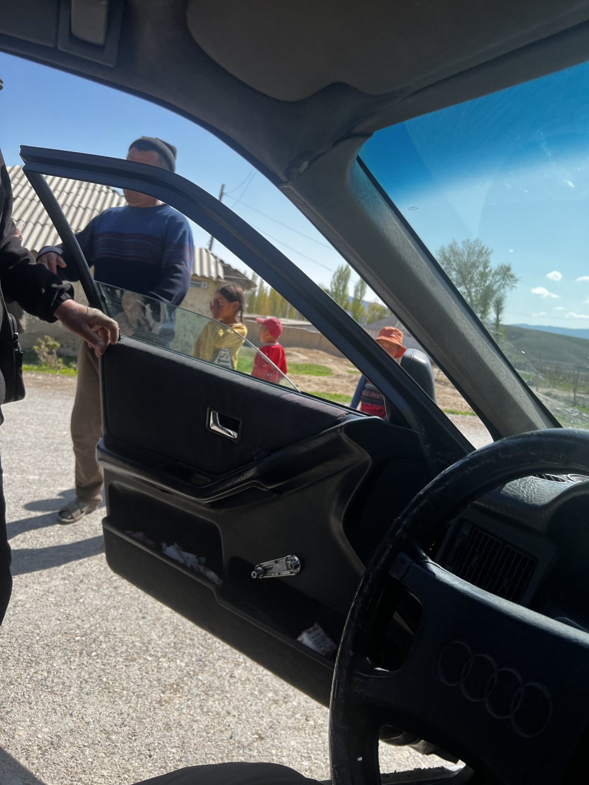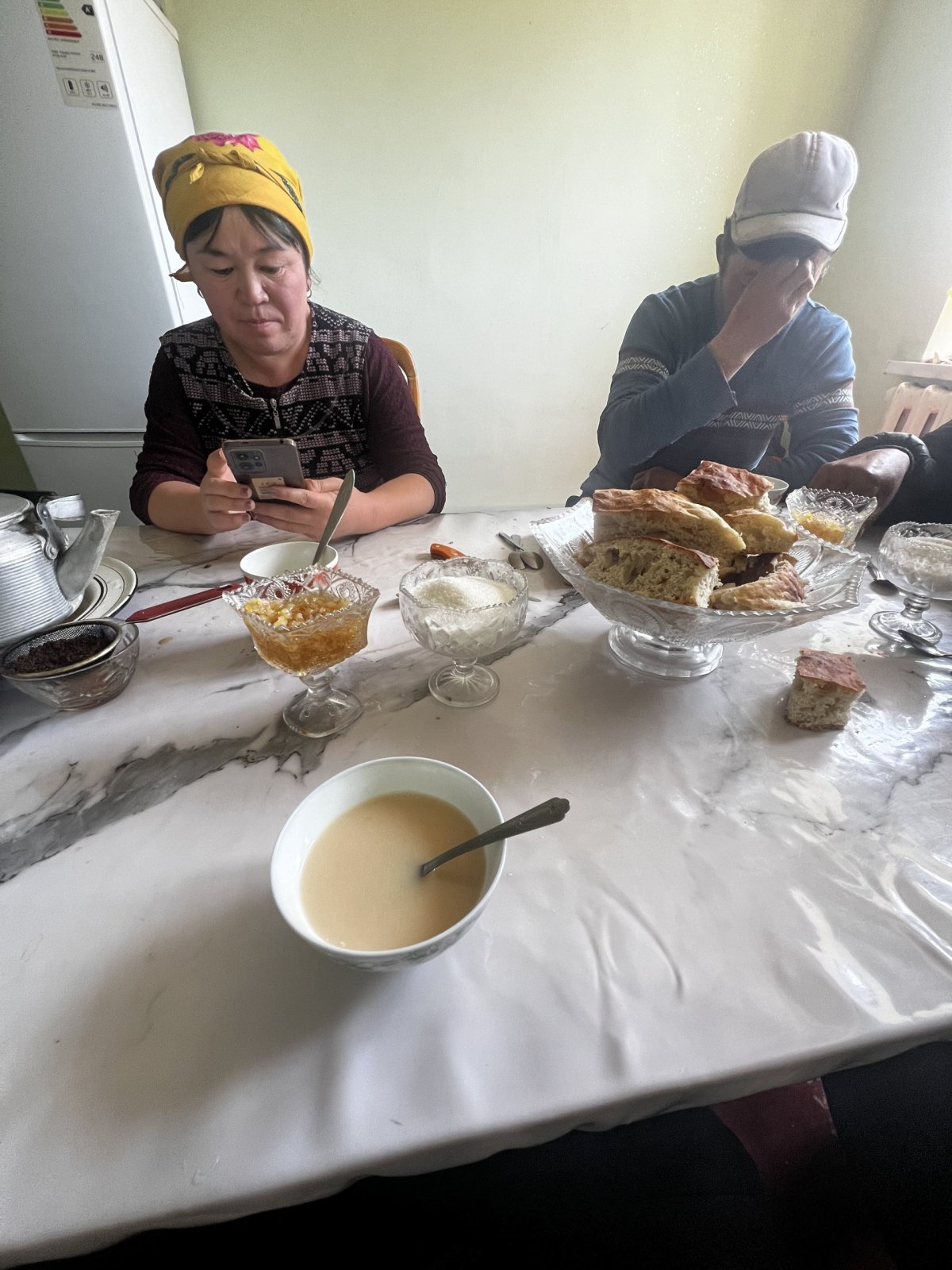 Sedím na šutru a přemýšlím co dál. Objízdná trasa je dlouhá cca 750 km namísto přímých 200 km. Volám Aibekovi, že uvažuji o jeho nabídce. Odpovídá, že nabírá akorát svojí mámu a může pro mě přijet a vzít mě. Dalších 8h a 400km trávím v autě s Aibekem a jeho mámou. Oba zlatí, po cestě zastavujeme na jídlo, Aibek mi vypráví o jeho prací, rodině i životě v Kyrgyzstánu. Voláme i jeho sestře, jakožto učitelce angličtiny. Moje ruština je totiž dost primitivní a některé věci si nejsme schopni vysvětlit v ruštině. Během hovoru mi přijde, že jeho sestra mluví anglicky asi jako já rusky, ale sem rád, že mám možnost pokecat i se ségrou.