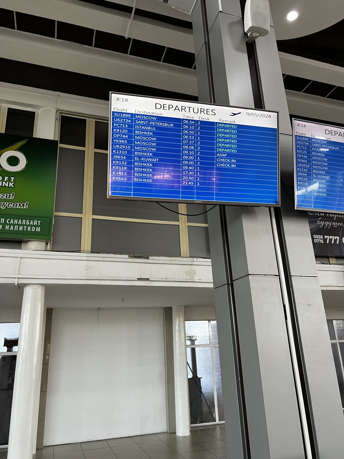 Aibek mě skutečně vyhazuje v Biškeku a já beru maršutku na letiště – deja vu. Na letiště přijdu v 18:00 a jdu k přepážce společnosti, které dneska letí ještě dvě letadla do Oše. Místo by snad mohlo být v posledním letu 20:30, pokud nepřijdou všichni. Mimochodem letadlo má zpoždění, jelikož zastavovalo v Jalal Abadu, aby nabralo děti, které včera srazil kamion při oslavách státního svátku.
