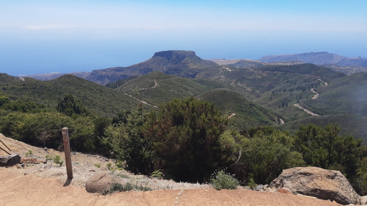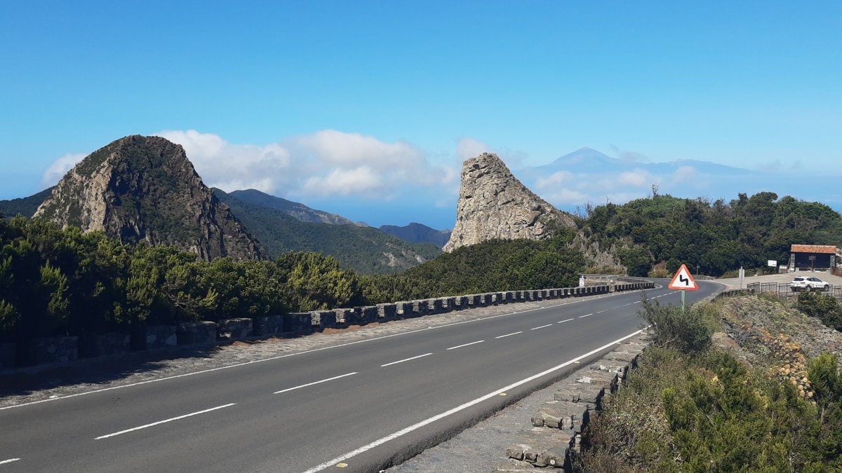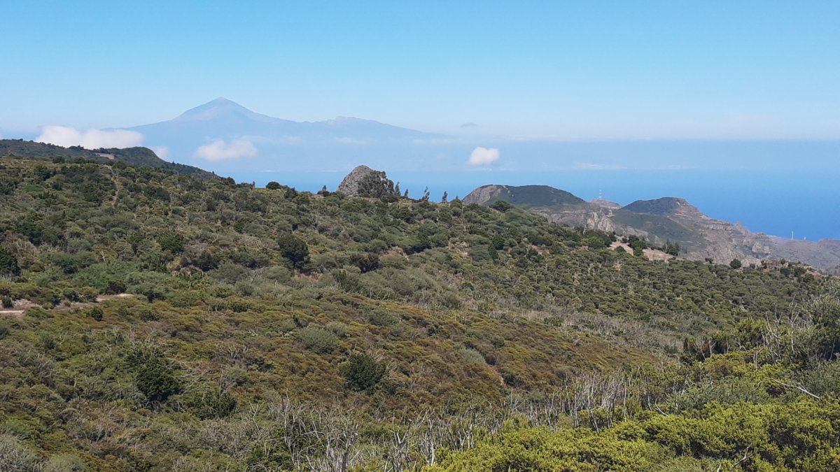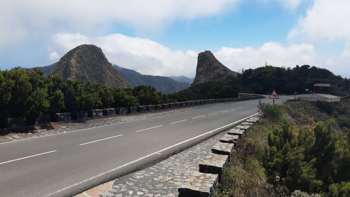 Z letiště stoupáme v naprosto minimálním provozu do středu ostrova po silnici CV-11, která by zde ještě dalších 50 let plně postačovala, ale místní ji kompletně v celé délce snad 15 kilometrů přestavují na novou, rychlejší a širší, takže nás brzdí několik semaforů. Vystoupáme téměř až na vrchol ostrova do nějakých 1.400 metrů a poprvé se potkáváme s místními hustými mlžnými lesy, stejnými, jako jsme viděli nedávno na El Hierro. Na jedné z lesních vyhlídek hned vedle cesty máme štěstí, vidíme nedaleké Tenerife s dominantní Teide. O kousel dál na jedné z dalších vyhlídek můžeme vidět místní les, který se zotavuje po rozsáhlém požáru z roku 2012, kdy podle údajů na informačních tabulích bude návrat do původního stavu trvat zhruba 100 let. Další, níže položená vyhlídka na západní pobřeží, je ale zahalena v mlze, která je ve vrcholových partiích ostrova povětšinou standardem.