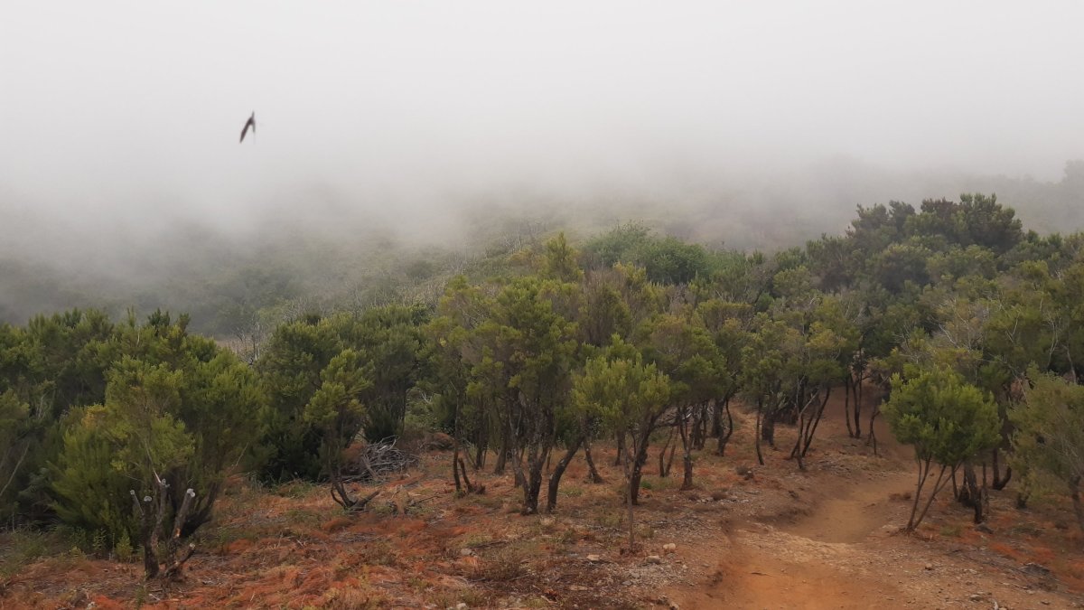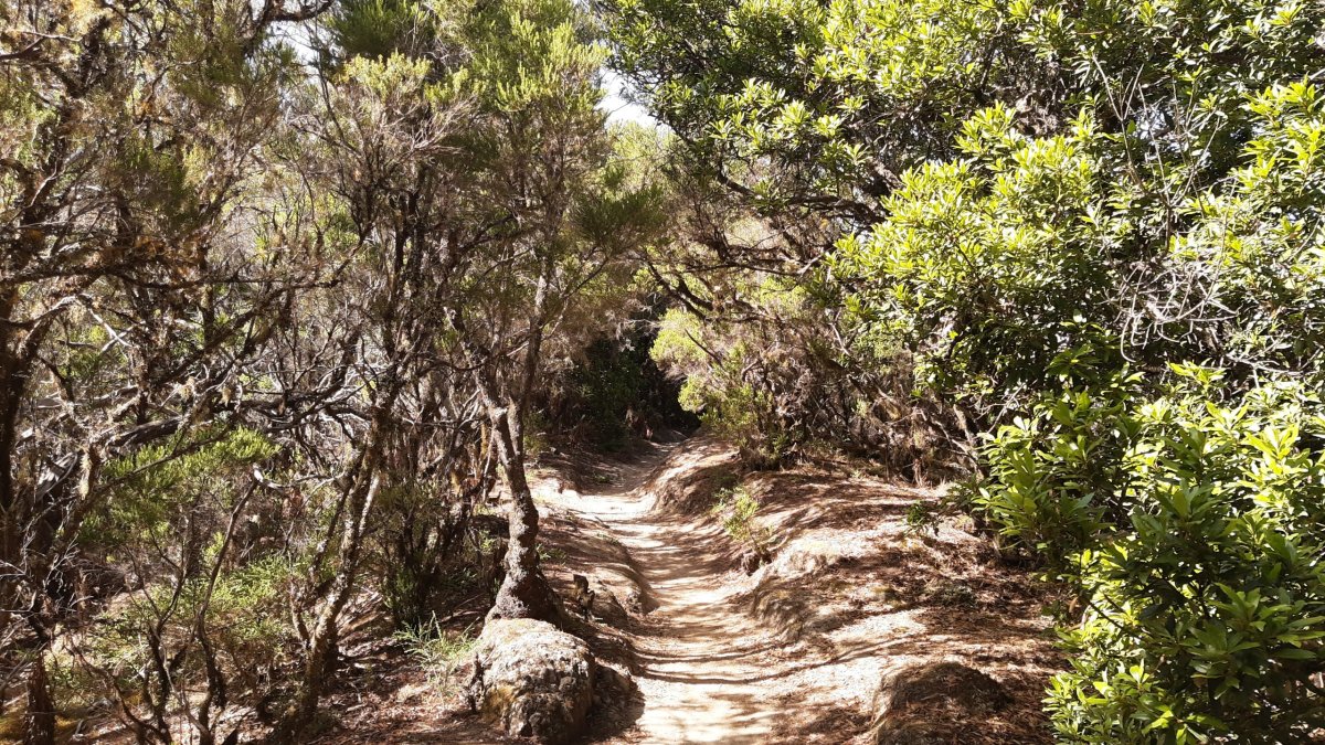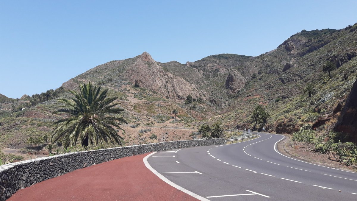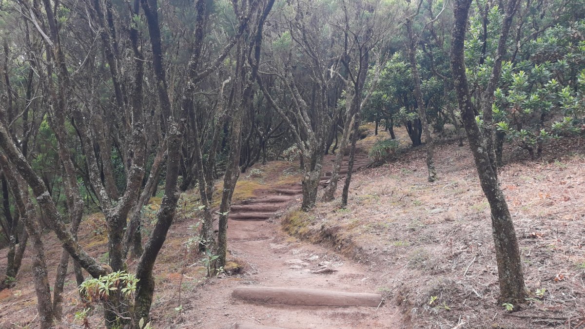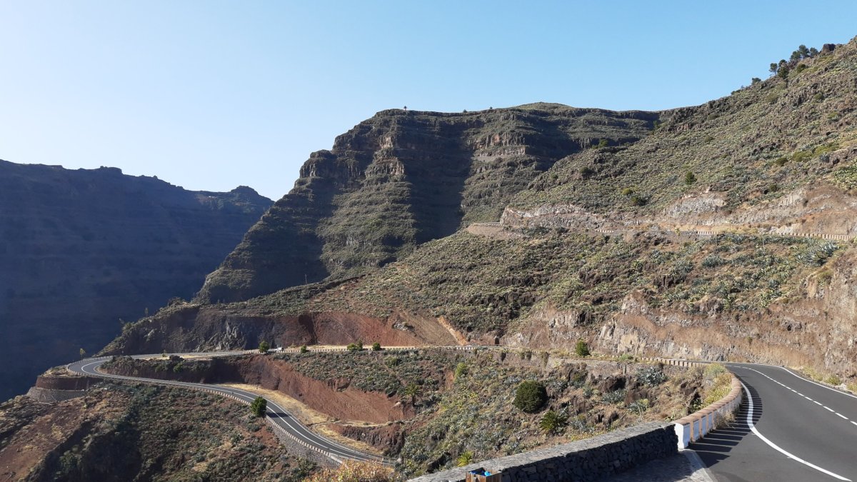 Z letiště stoupáme v naprosto minimálním provozu do středu ostrova po silnici CV-11, která by zde ještě dalších 50 let plně postačovala, ale místní ji kompletně v celé délce snad 15 kilometrů přestavují na novou, rychlejší a širší, takže nás brzdí několik semaforů. Vystoupáme téměř až na vrchol ostrova do nějakých 1.400 metrů a poprvé se potkáváme s místními hustými mlžnými lesy, stejnými, jako jsme viděli nedávno na El Hierro. Na jedné z lesních vyhlídek hned vedle cesty máme štěstí, vidíme nedaleké Tenerife s dominantní Teide. O kousel dál na jedné z dalších vyhlídek můžeme vidět místní les, který se zotavuje po rozsáhlém požáru z roku 2012, kdy podle údajů na informačních tabulích bude návrat do původního stavu trvat zhruba 100 let. Další, níže položená vyhlídka na západní pobřeží, je ale zahalena v mlze, která je ve vrcholových partiích ostrova povětšinou standardem.