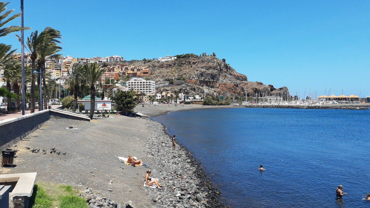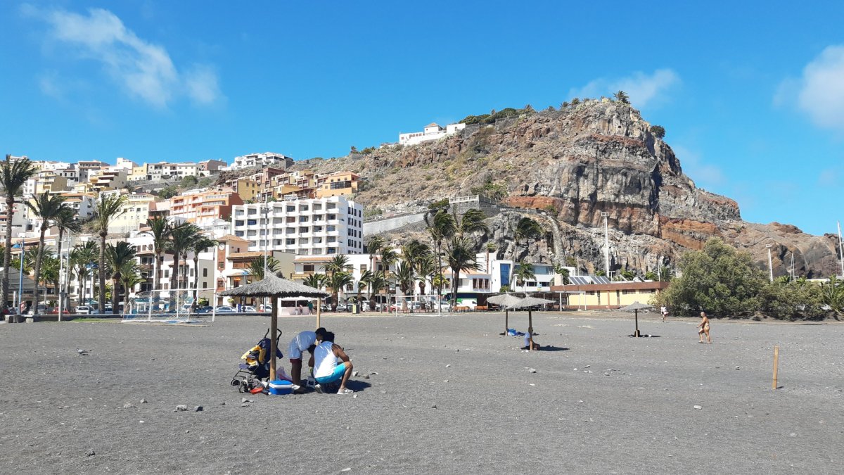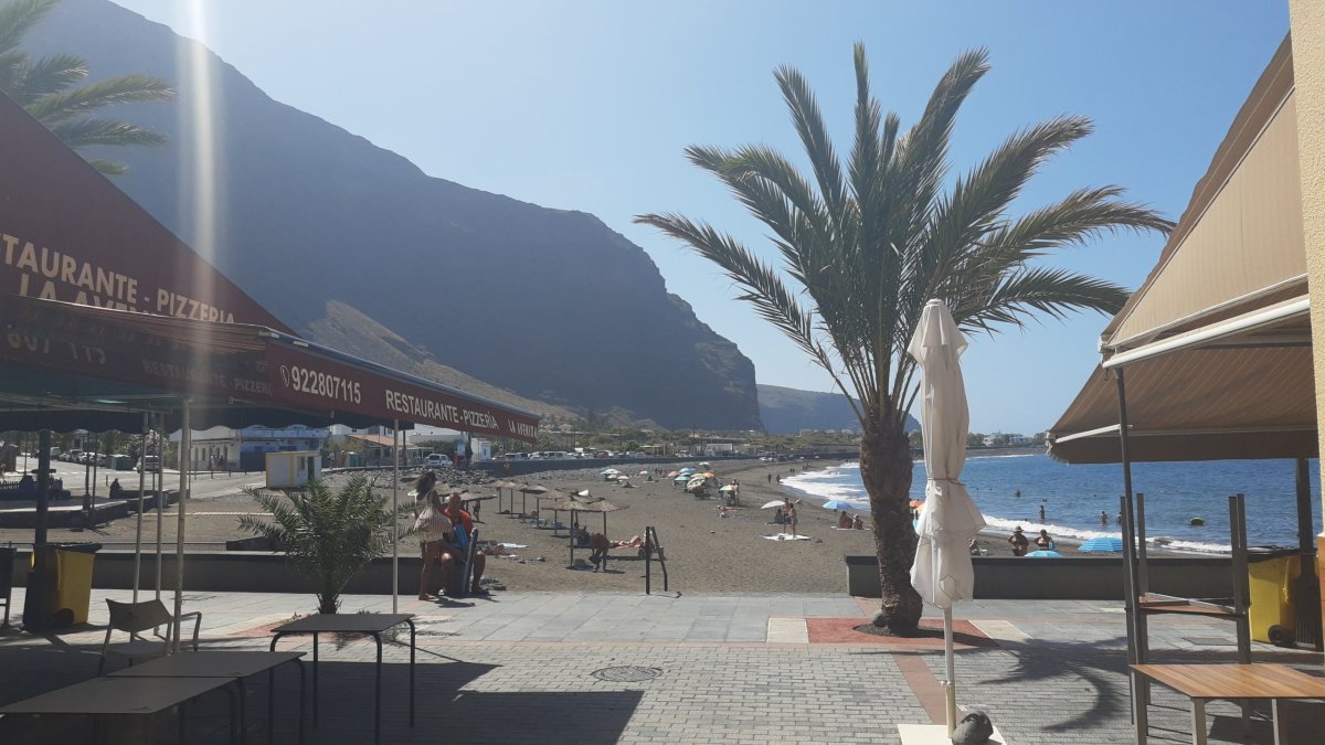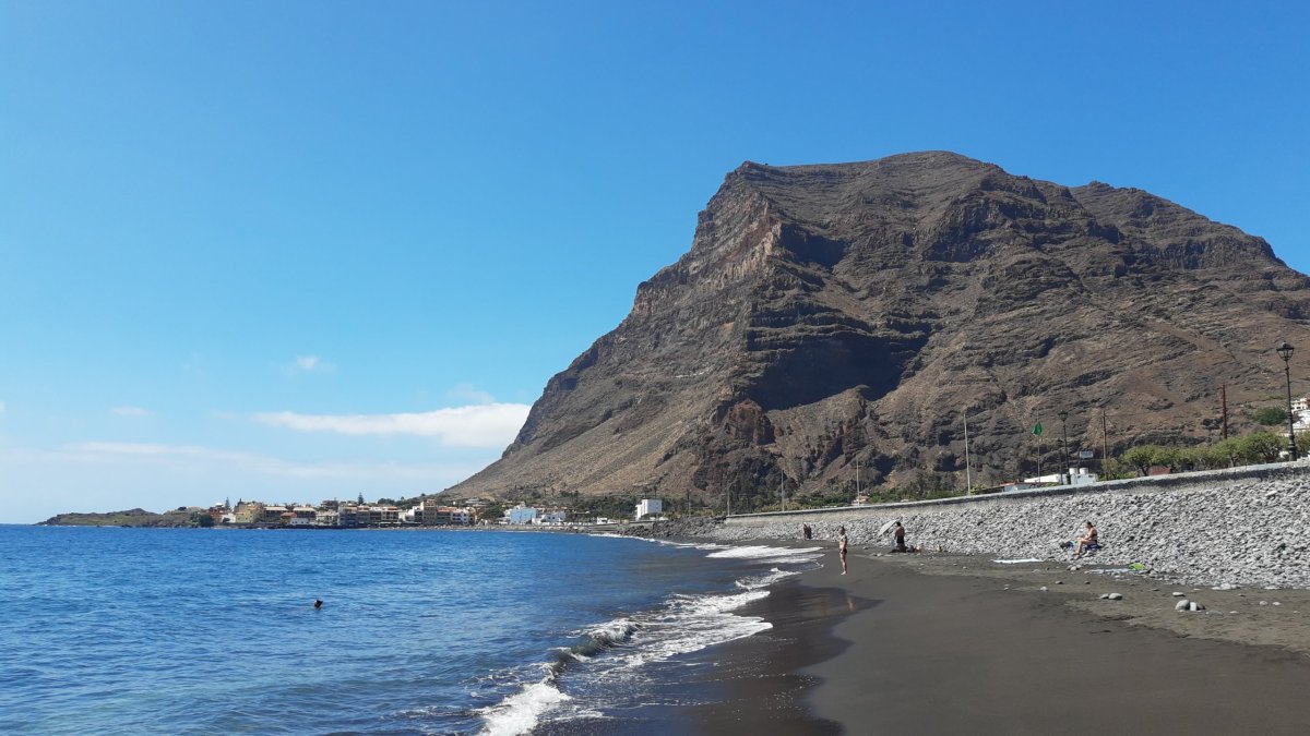 Když se vracíme, padne nám do oka směrovka „pláž“ směřující někam do kopce. Tak se po úzké a ještě užší cestě přes hřeben vydáváme liduprázdným údolíčkem dolů k moři, kde je malá kamenitá pláž s parádním výhledem na Teide a Tenerife. Na pláži je malá kaplička a plné zázemí – WC a nějaká občerstvovna. Moře je ale velmi divoké, takže pláž je dnes mimo provoz. Proto pak pokračujeme do hlavního města ostrova – San Sebastian. Parkujeme opět zcela bez problémů na velkém parkovišti u poloprázdné pláže.