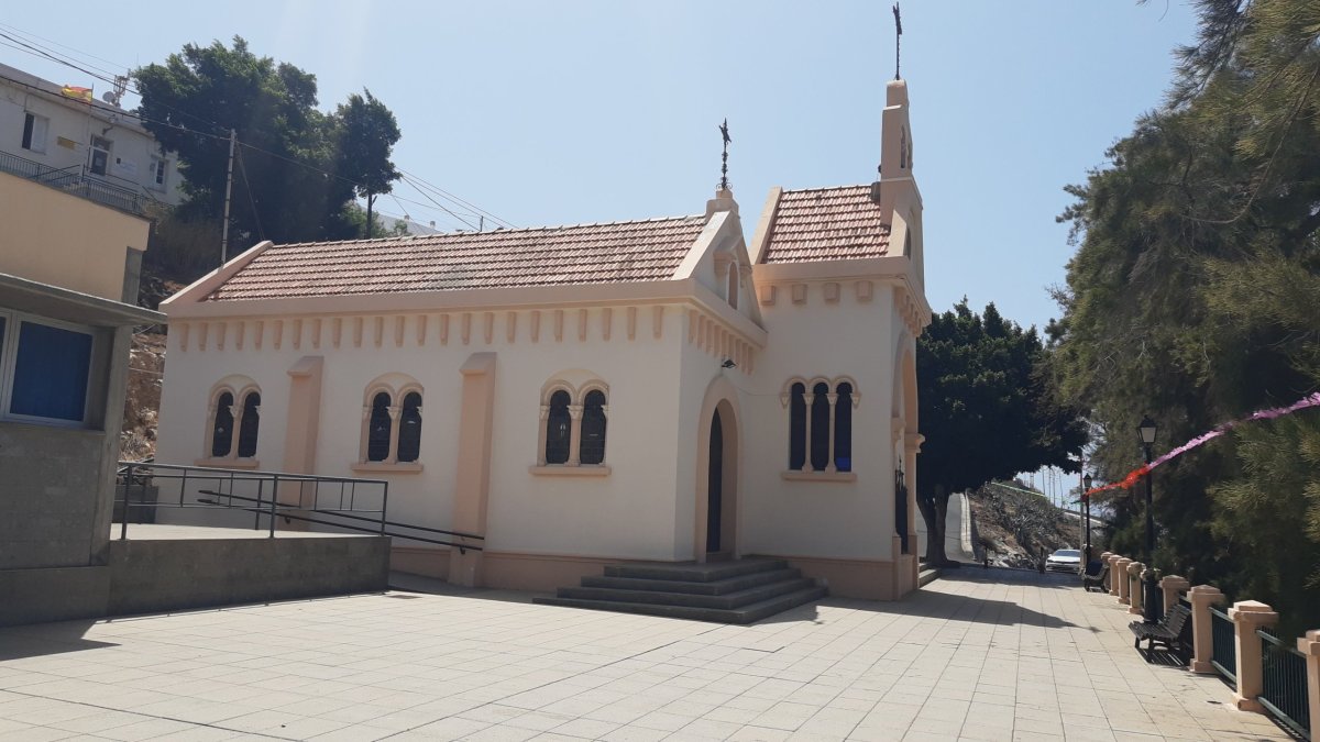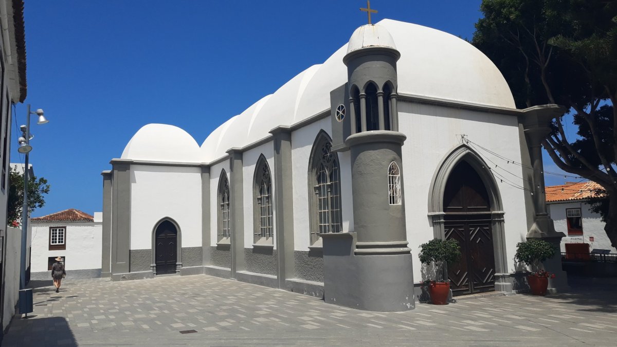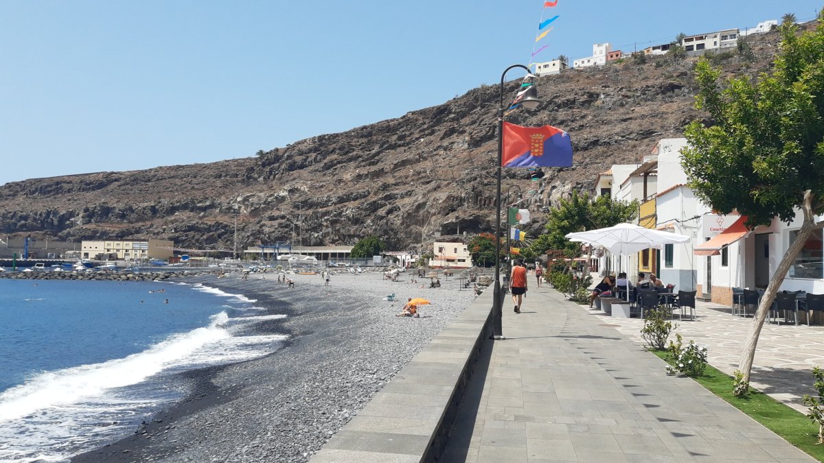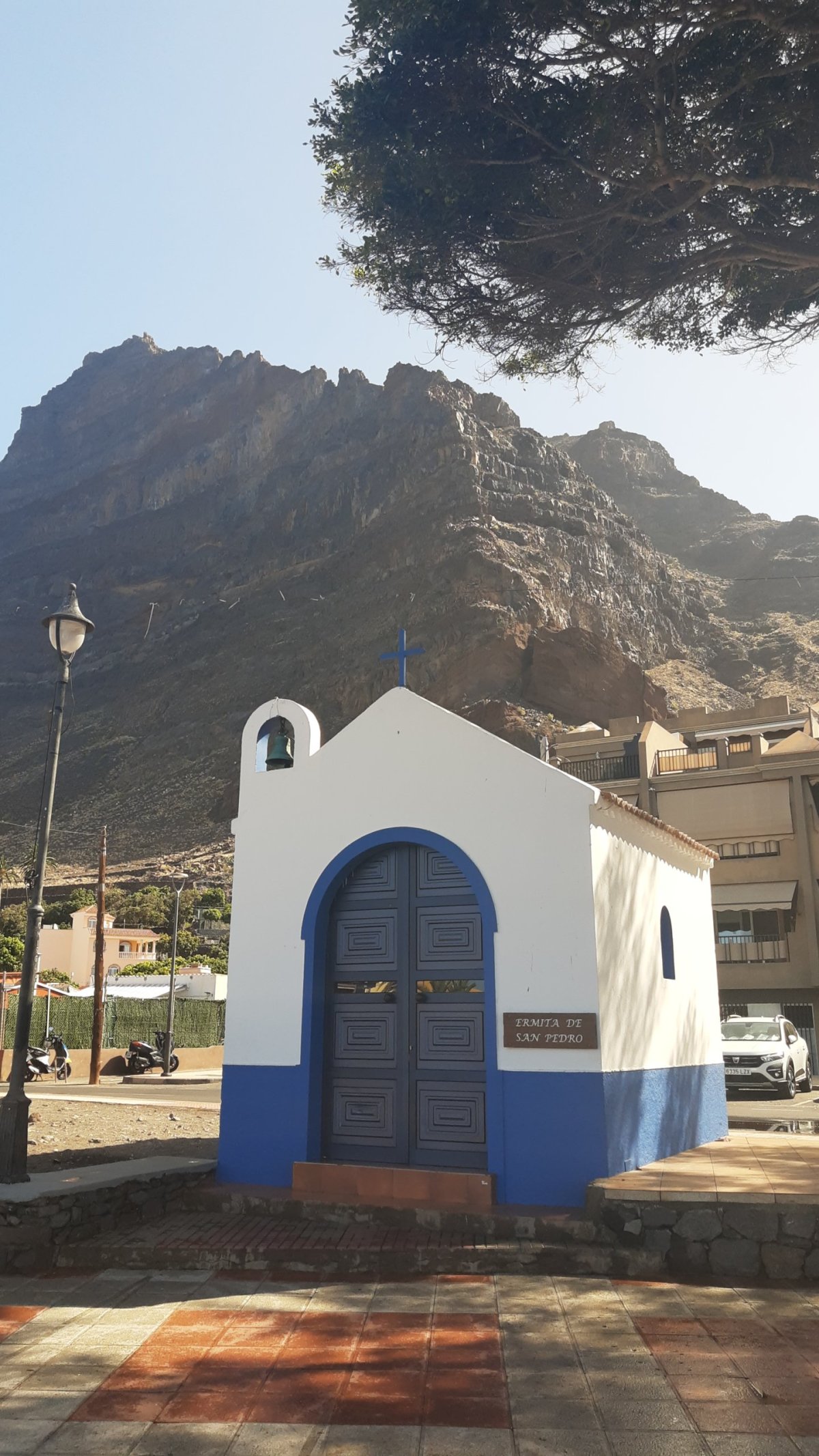 Když se vracíme, padne nám do oka směrovka „pláž“ směřující někam do kopce. Tak se po úzké a ještě užší cestě přes hřeben vydáváme liduprázdným údolíčkem dolů k moři, kde je malá kamenitá pláž s parádním výhledem na Teide a Tenerife. Na pláži je malá kaplička a plné zázemí – WC a nějaká občerstvovna. Moře je ale velmi divoké, takže pláž je dnes mimo provoz. Proto pak pokračujeme do hlavního města ostrova – San Sebastian. Parkujeme opět zcela bez problémů na velkém parkovišti u poloprázdné pláže.