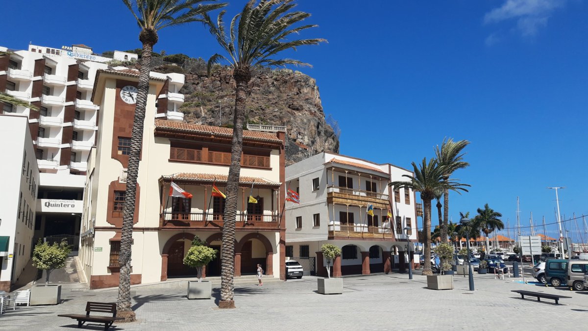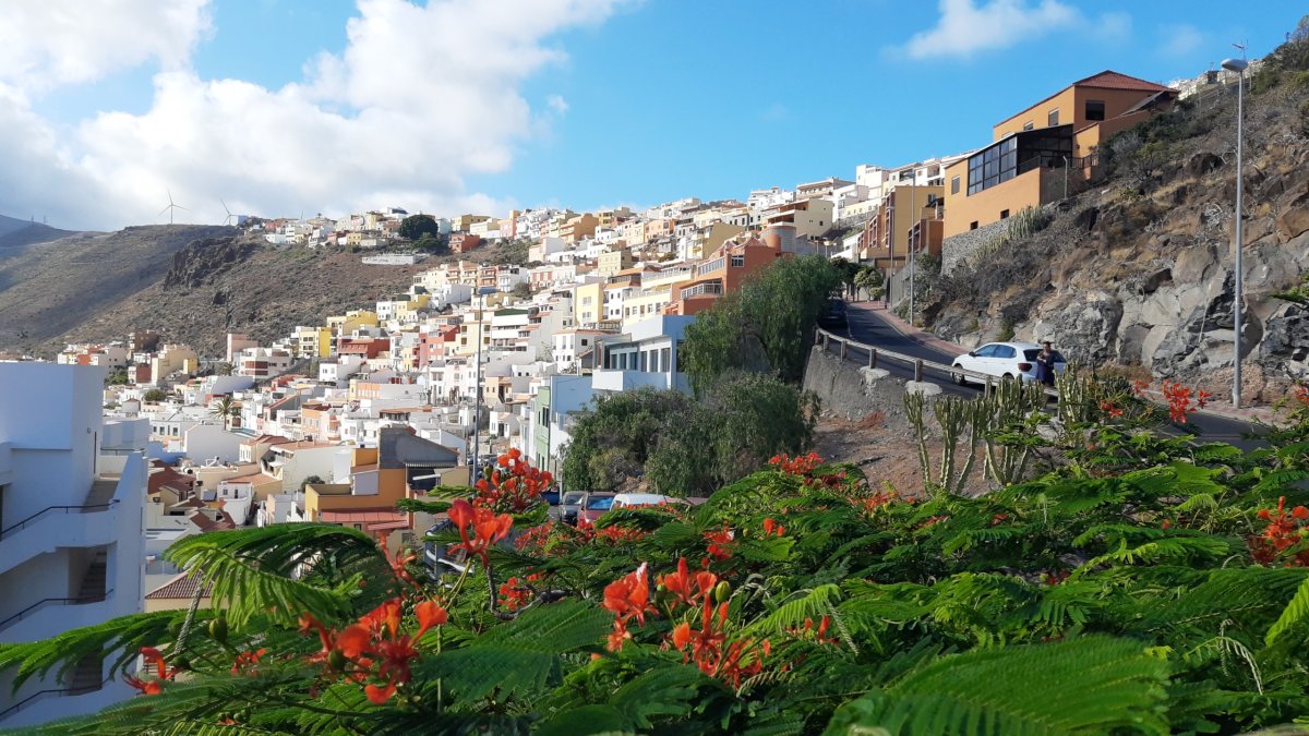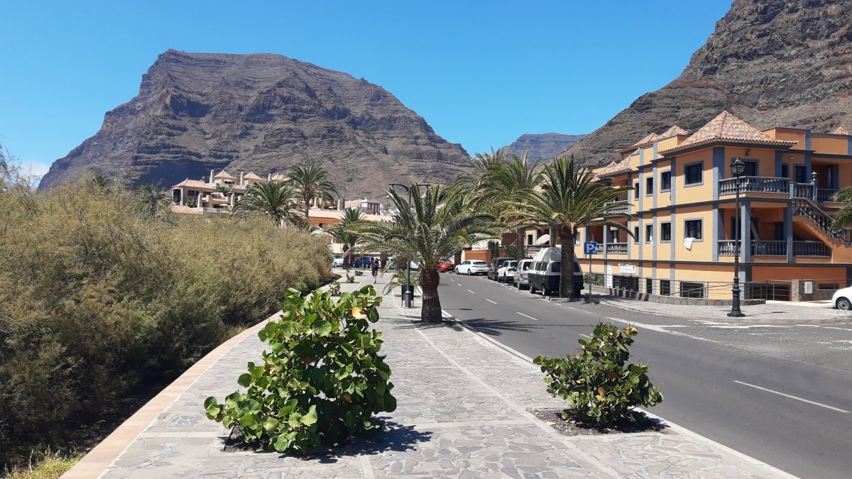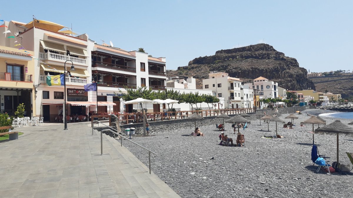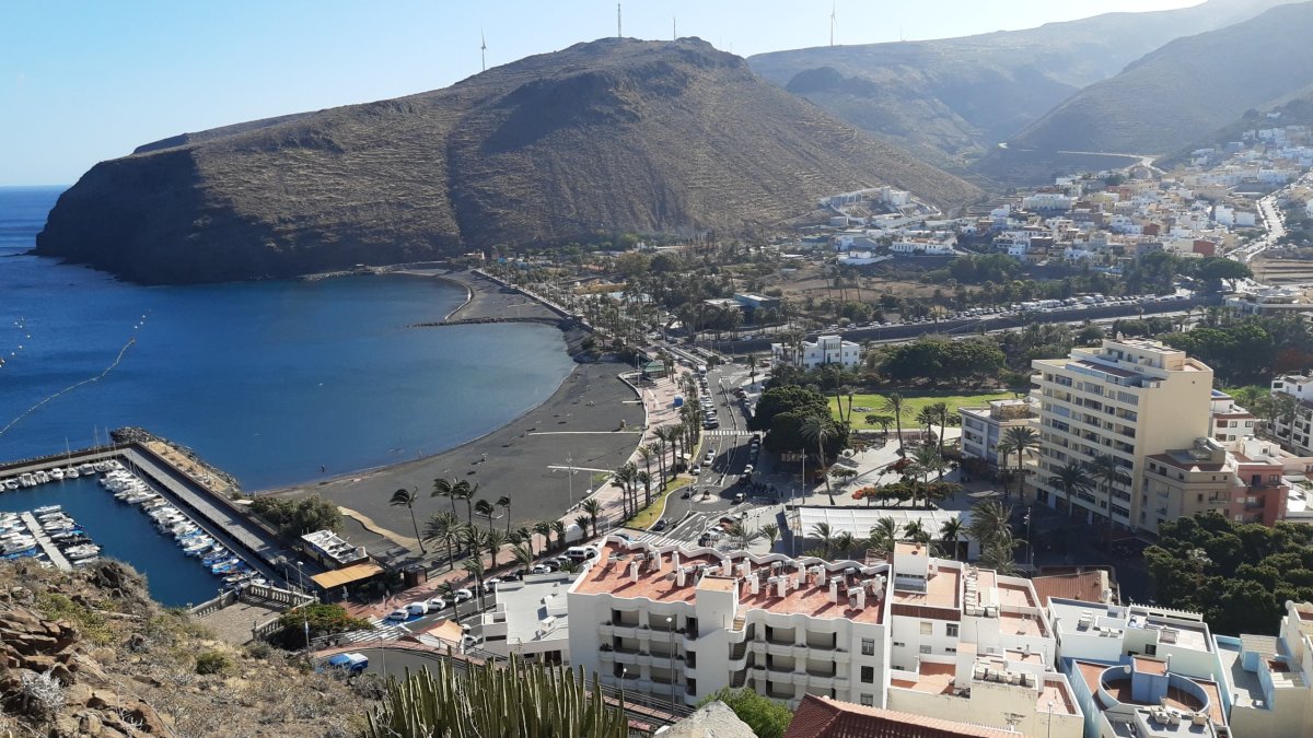 Třetí den pobytu se přesunujeme z GranCan na La Gomera. Čas do odletu trávíme na jedné oblázkovo-písčité pláži v San Augustin pohodovým koupáním. Pak na letišti necháváme auto s klíčky a parkovacím lístkem na sedadle. Tak jako i na jiných ostrovech, část terminálu pro meziostrovní lety připomíná spíše vlakové nebo autobusové nádraží, protože většina cestujících jsou místní, kteří letecké přesuny využívají jako místní dopravu. Což je pochopitelné, protože díky dotacím mají letenky proti turistům za pouhou čtvrtinu ceny, tzn. obvykle někde mezi 5-15 EUR za let. Přelet na La Gomera je otázkou pár desítek minut a součástí je dokonce i občerstvení – kelímek vody a pytlík kukuřice s papájou … A palubní personál na vás automaticky mluví španělsky.
