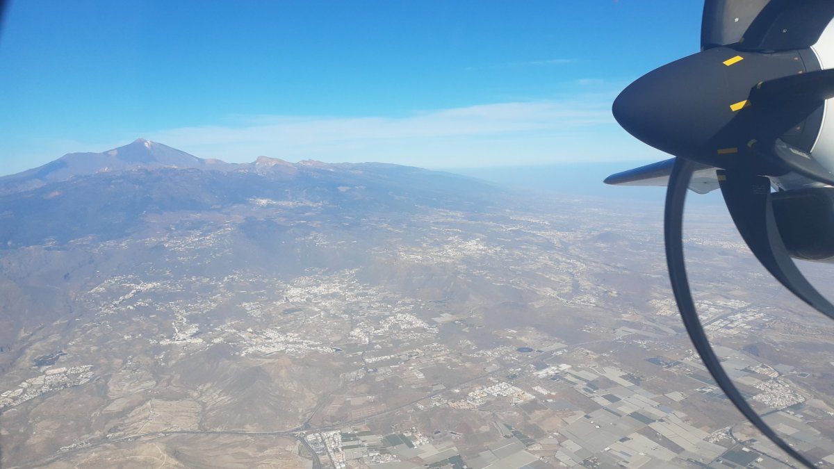 Po dvoudenním pobytu na jižním pobřeží Tenerife tak po obědě vyrážíme na letiště, odkud jednou denně létá přímý let Binteru na La Palmu. Jedná se o jediné spojení z jižního letiště, protože všechny ostatní lety, a je jich přes 20 denně, létá ze severního letiště. Při check-inu nám zabavují naše příručáky na kolečkách, protože místní dvouvrtuláky mají na palubě menší a omezené schránky na zavazadla než větší letadla, a náš let je vcelku vytížený. Letadla tu fungují jako místní doprava, takže letenky jsou bez místenek a během letu dostáváme trochu vody a musli tyčinku. Ostatně let trvá jen asi 30 minut.