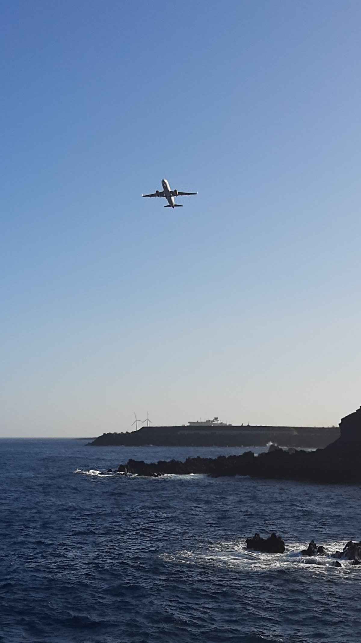 Jdeme na prvotní průzkum a pořídit nějaké zásoby tekutin pro další pobyt a zbytek slunečného prosincového odpoledne trávíme až do soumraku u moře na opuštěné vyhlídce pod hotelem. Pozorujeme odlétající letadla, podle kterých si pak můžeme celý pobyt řídit hodinky – v celou Binter, o čtvrt Canary. Občas se mezi lokální linky vklíní i větší charterový Airbus.