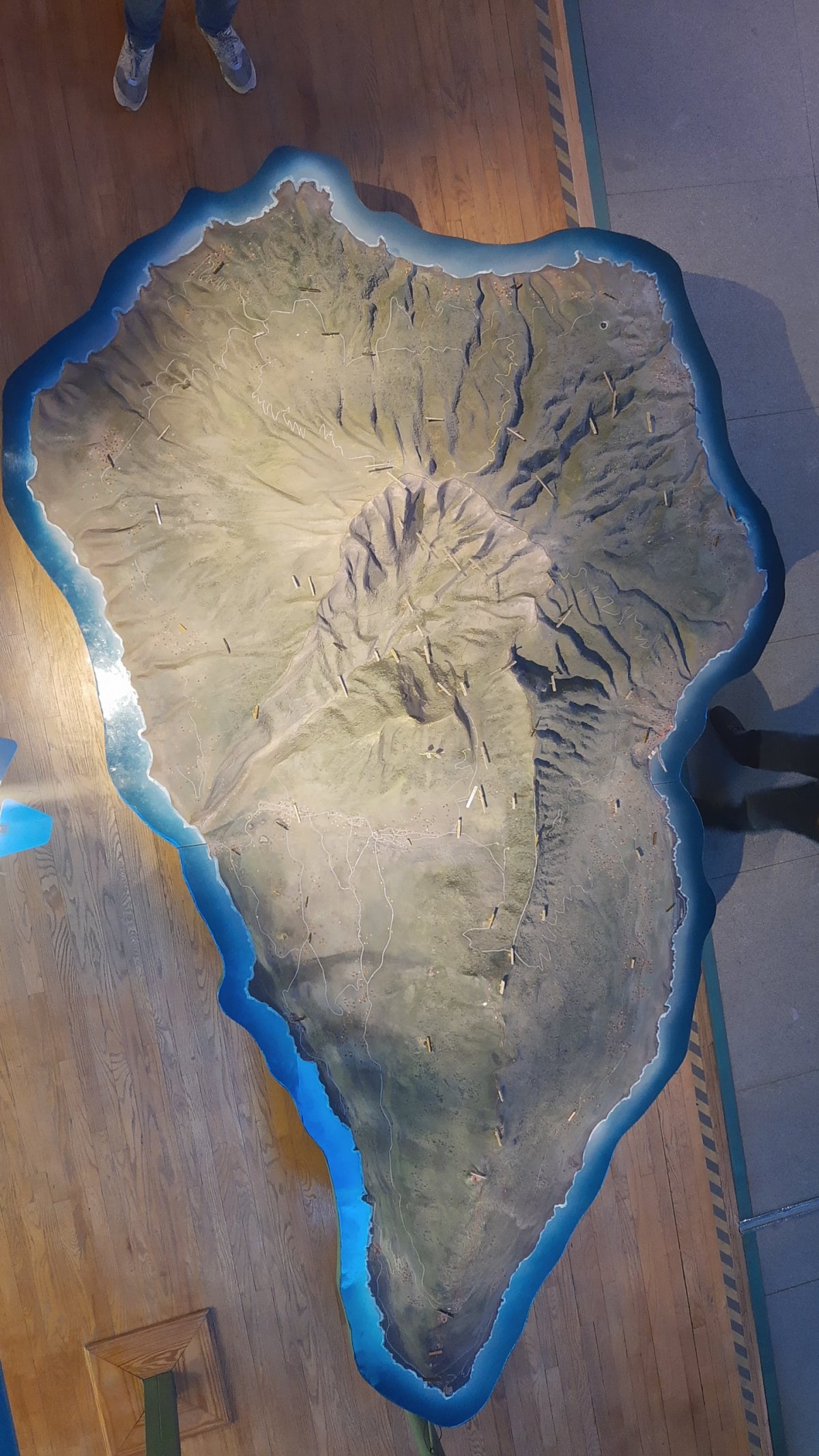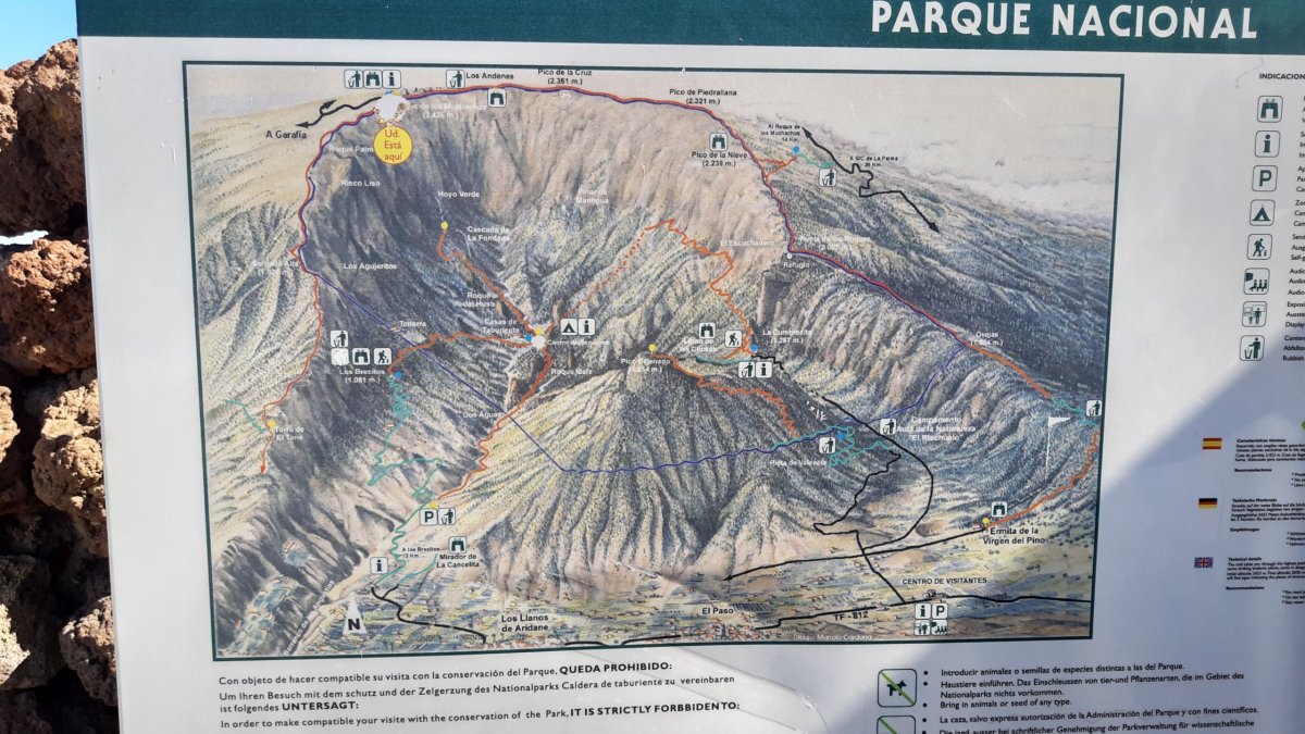 Čtvrtý den, poslední den roku 2019, máme v plánu jednu z „povinných“ atrakcí ostrova, výjezd na vyhlídku La Cumbrecita uvnitř krátera. Zvláštností je zde to, že kvůli velmi omezené kapacitě místního malého parkoviště je potřeba si vjezd dopředu na potřebný čas i délku pobytu rezervovat na webu, popř. přímo v turistických centrech i jinde na La Palmě. Vyrážíme s časovou rezervou, takže máme i půlhodinu na informační centrum u odbočky, kde je spousta informací o vzniku ostrova, jeho geomorfologii, floře i fauně. Dominantou je velký plastický model ostrova.