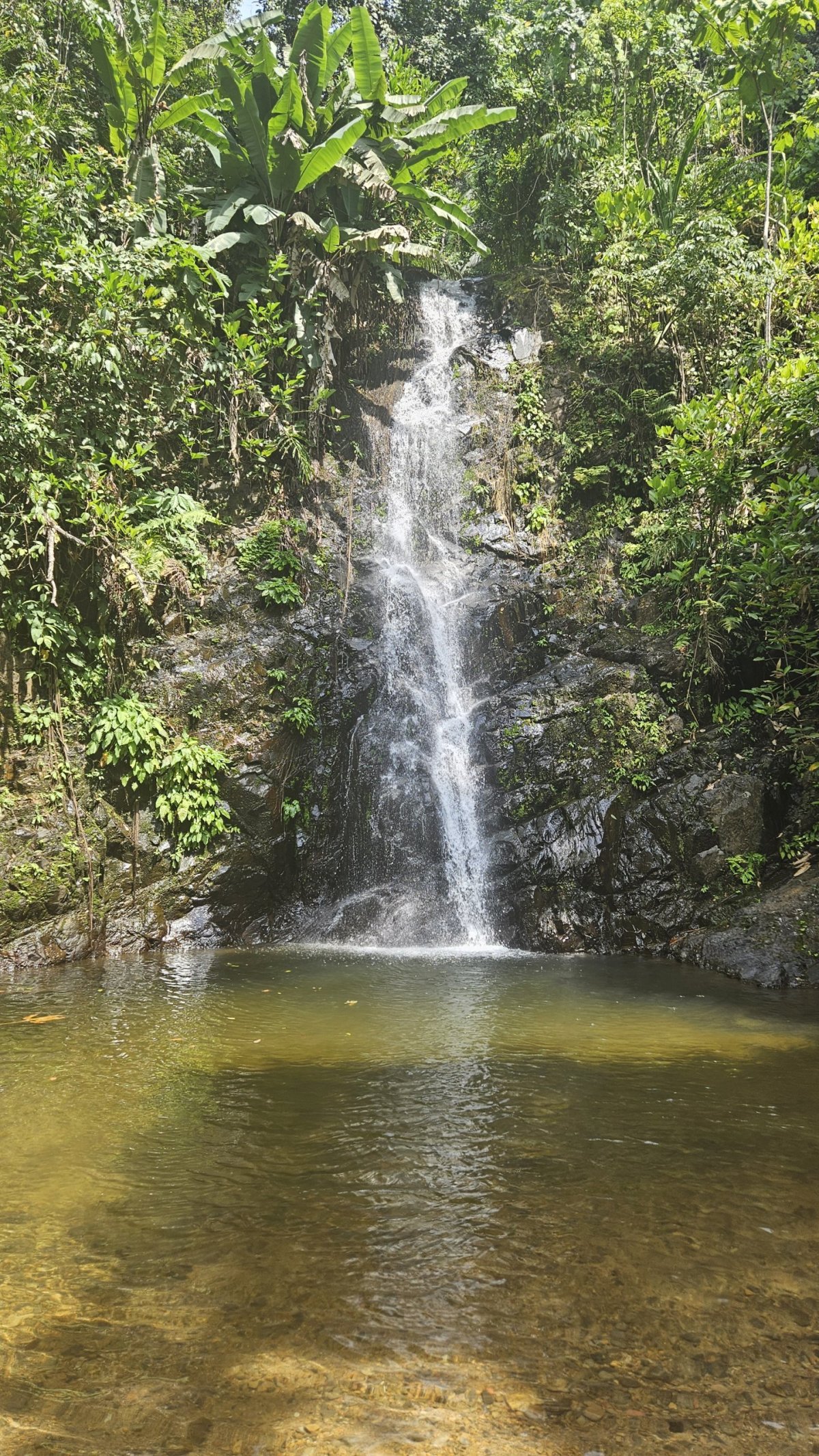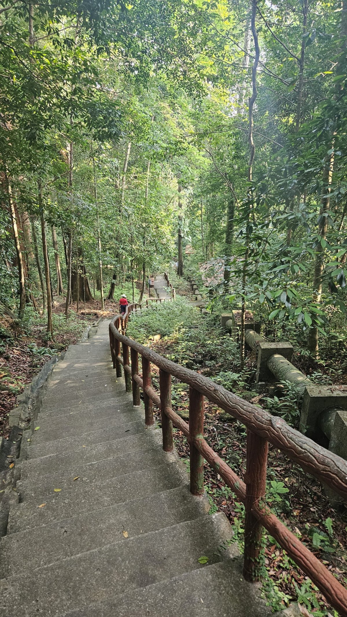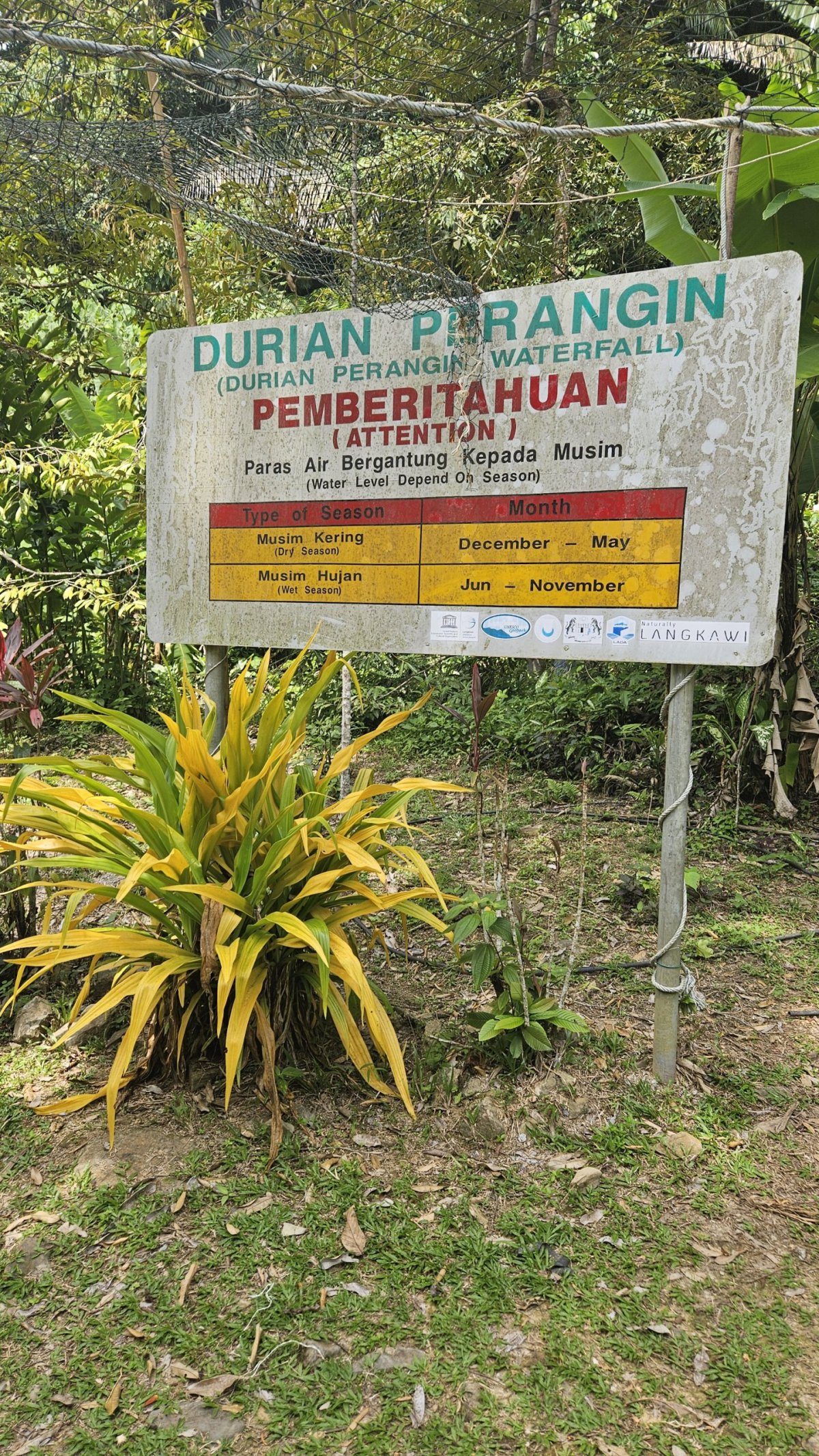Následující den tak vyrážíme na severní pláže, ale cestou si ještě děláme zastávku u vodopádu Durian Perangin, který je tak 2 kilometry od hlavní cesty. Opět, prázdné neplacené parkoviště, pár stánků se zbožím, suvenýry i jídlem u něj, a skoro nikde nikdo. Protože jde o zřejmě soukromý pozemek, tak se zde vybírá vstupné. A to je ... 1 MYR (5 Kč) na osobu! Naprosto směšné proti tomu, co daná lokalita nabízí. Na začátku stezky je lanový most a několik altánků u potoka a lagun, kde je možnost naprosto idylického odpočinku a koupání. My pokračujeme dál po stezce a schodech do kopce k vodopádu. Ten je menší, ale za to v plné síle. Kromě nás tu je jen jedna další dvojice, takže tu na posedáváním a koupáním v laguně strávíme pohodovou skoro hodinu.