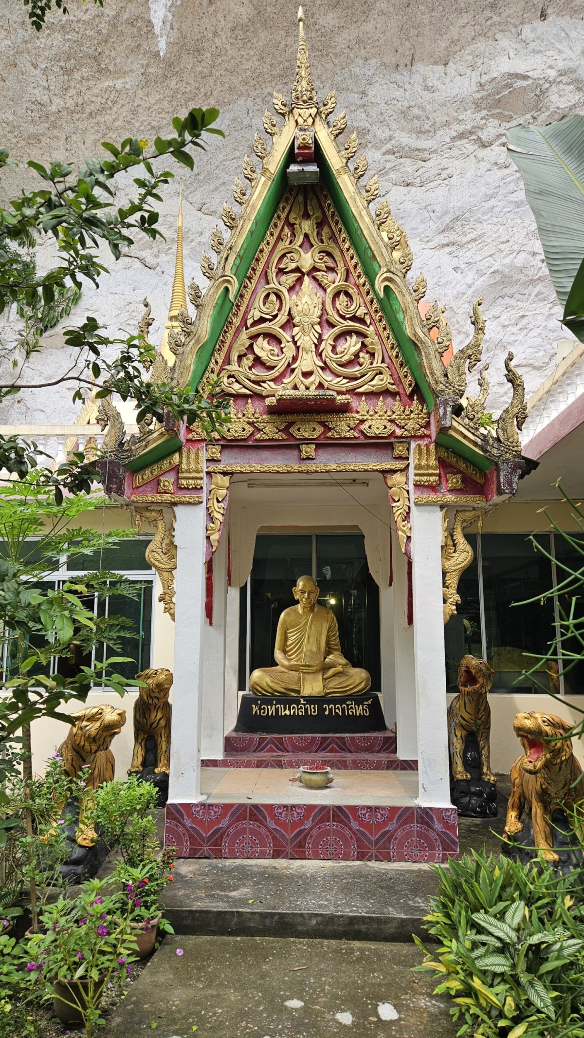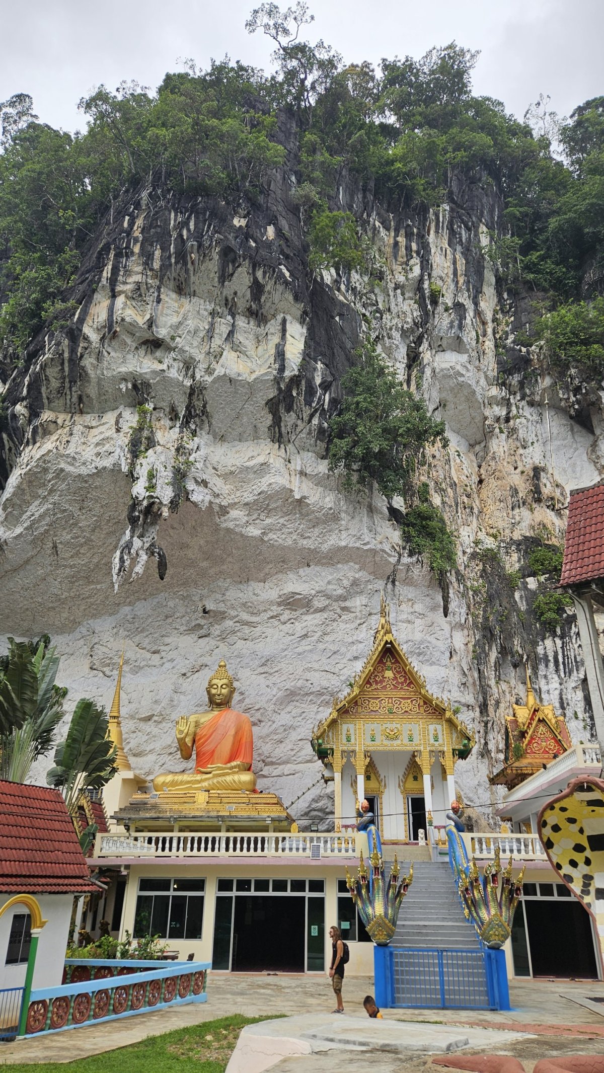Poslední celý den našeho pobytu, cestou na severní pláže, zajíždíme kousek nad Kuahem k budhistickému chrámu Wat Koh Wanararm, který je schovaný pod vysokou skálou. Ten jsme sice chtěli navštívit už o den dříve, večer, ale když se začali sbíhat psi, sic obecně neškodní, tak ve chvíli, kdy jejich počet přesáhl kritickou mez, jsme raději moudře ustoupili. Navíc už bylo zavřeno … Dnes je ale krásně, psi jsou vyvalení ve stínu a je otevřeno. Nejsem odborník na danou problematiku, ale chrám mi z poloviny připadl spíše jako „duchovní“ muzeum, neboť zde bylo vše – sedící Buddha, všemožní bůžci, socha místního mnicha, sochy zvířat. A taky nádherní čínští draci zdobící schodiště, ti opravdu stáli za to. A až při přidávání fotek do tohoto cestopisu jsem si všiml, že místní svatí mají různé chutě. Jednoho z nich někdo uctil kartonem Guinessů ...