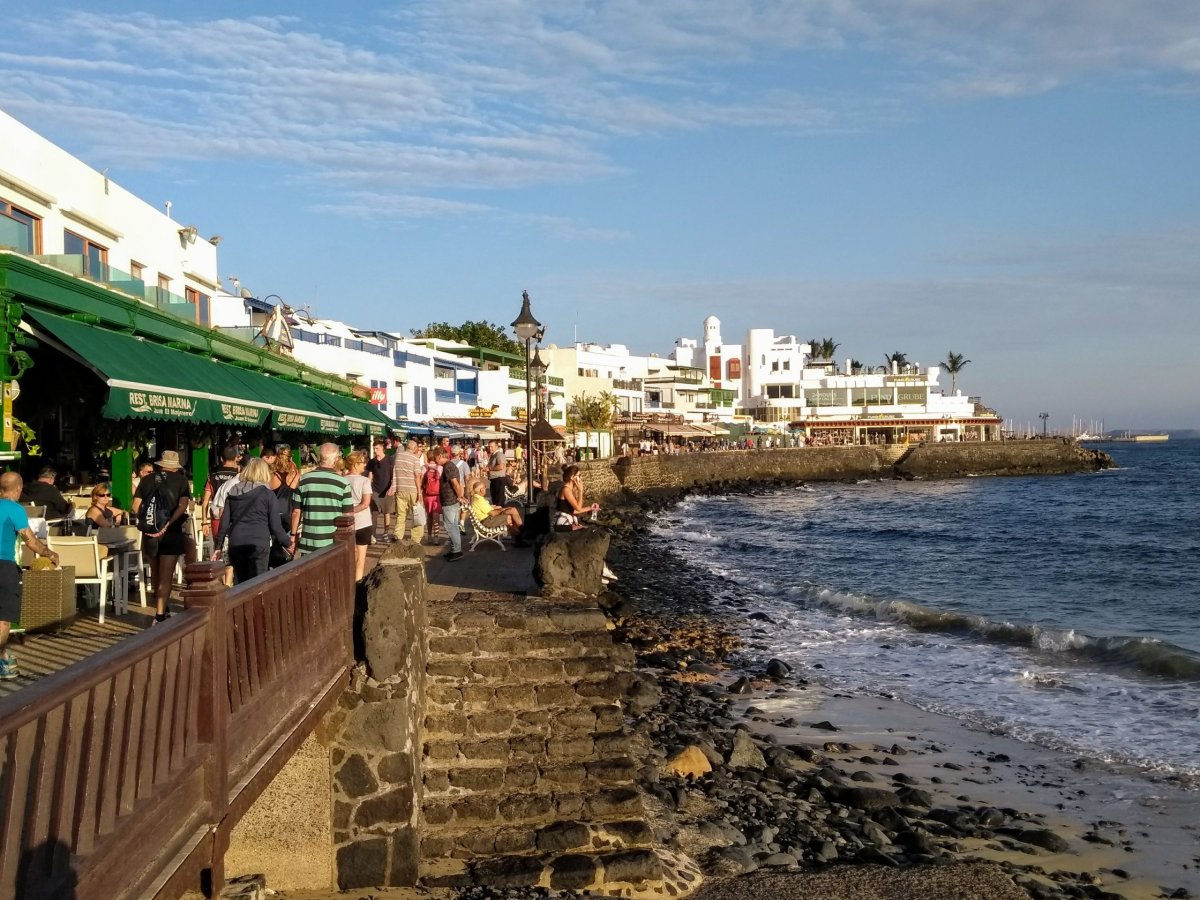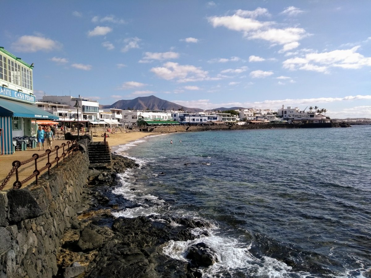 Až na místě ovšem zjišťujeme, že tento má celkem sedm bloků, z nichž čtyři se nachází přímo u pobřežní promenády a tři jsou o pár set metrů dál. My z nějakého důvodu máme první noc jinde, než ty zbylé, takže nás někdo z recepce vezme asi o dva bloky dál, kde má rezort šest odloučených bungalovů. Je mimo hlavní sezonu, takže zde po celou dobu pobytu vůbec není problém s parkováním. A protože se máme hned zítra stěhovat někam vedle, ani se nevybalujeme a hned, protože je ještě světlo, vyrážíme na obhlídku nejbližšího okolí. K moři to máme kousek a přímořská promenáda se táhne kolem možná dvoukilometrové pláže do turisticky rušného centra Puerto del Carmen. My jsme na jeho podstatně klidnějším východním okraji. Pár set metrů od ubytování nacházíme i obchodní centrum se dvěma supermarkety, bary a restauracemi, takže děláme první základní nákup a v jedné z restaurací si dáváme večeři.