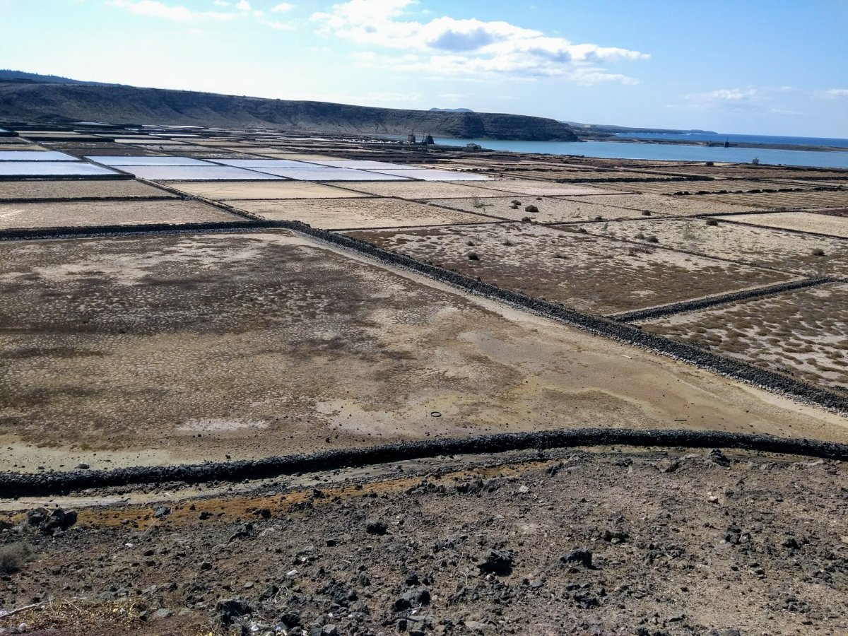 První den na Lanzarote směřuje naše cesta na jih do letoviska Playa Blanca. Pár kilometrů jedeme po dálnici, která se následně mění v přehlednou okresku s velmi svižným provozem. V Playa Blanca si procházíme centrum a pobřežní promenádu, u které je v centru malá písečná pláž. Poté sedáme do auta a jedeme kousek zpět na sever, kde jsou na západním pobřeží místní saliny Janubio – stovky velkých i malých bazénů pro těžbu soli. V krámku si za euro kupujeme pytlík místní mořské soli a pokračujeme dál na sever. Na chvíli nás zdrží nečekaný zážitek, natáčení reklamy na nějakou novou audinu, kvůli čemuž je krásná pobřežní cesta na chvíli uzavřena. Když pak míjíme skupinku filmařů, ti spěšně schovávají natáčená auta pod plachty. O kousek dál zastavujeme na pobřežní vyhlídce u divokých útesů Los Hervideros.