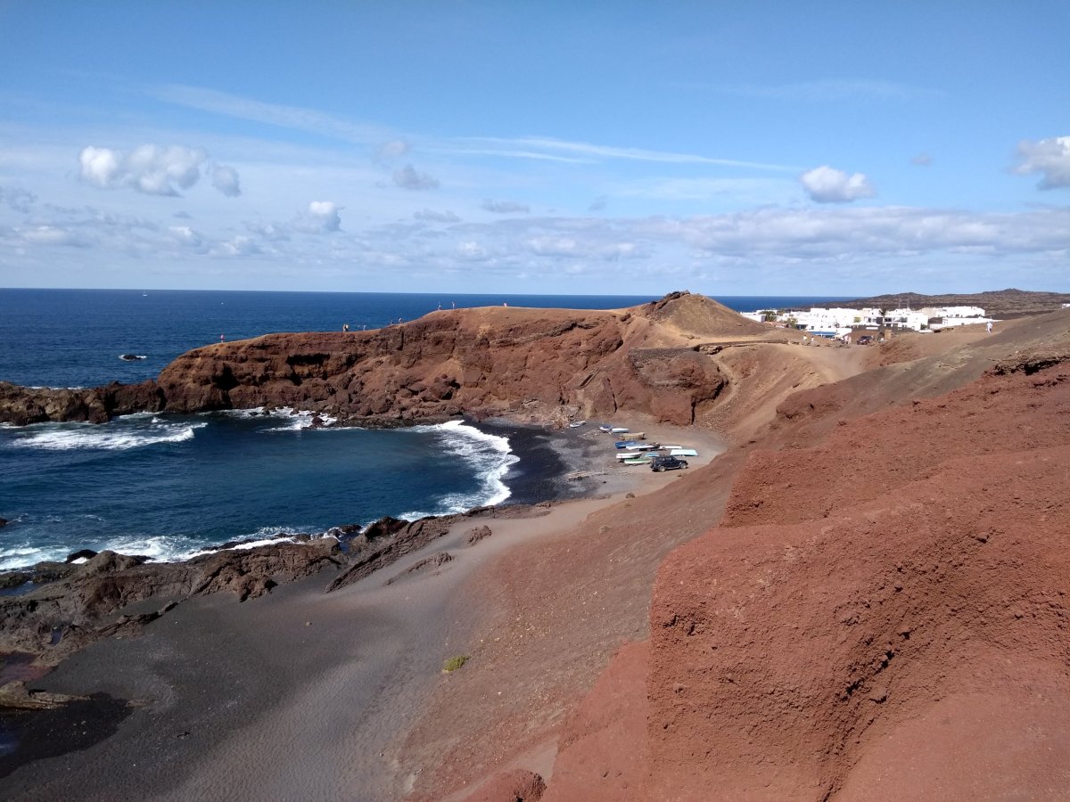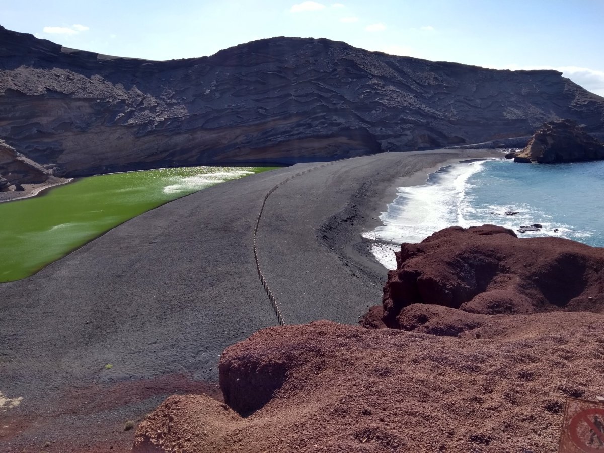 Dalším naším cílem je pobřežní vesnička El Golfo, kde naleznete jeden z přírodních unikátů Lanzarote, často zachycen na pohlednicích či jiných propagačních materiálech – El Lago Verde. Parkujeme na parkovišti před vesnicí a jdeme na vyhlídku se na ten barevný unikát podívat. A je na co koukat – modrý oceán, černá pláž a za ní zelená laguna pod příkrým útesem.