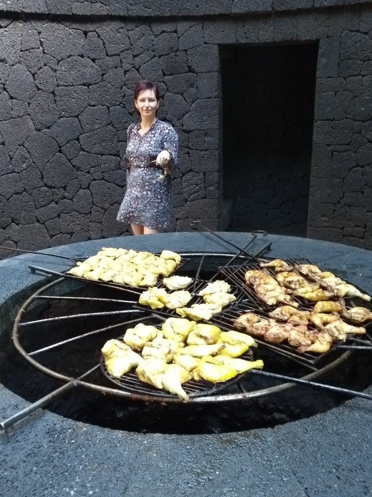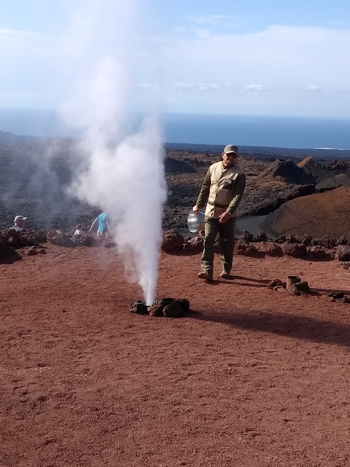 Po skončení projížďky přichází ještě pokus nalákat nás do restaurace. Nejprve nám ukazují, co se stane, když hrknete vědro vody dovnitř stále žhnoucí země, ze které následně vystříkne sloup páry. Chutě nám chtějí vzbudit ukázkou mnoha kil masa pečeného na skutečném přírodním lávovém grilu v podobě velké studny.