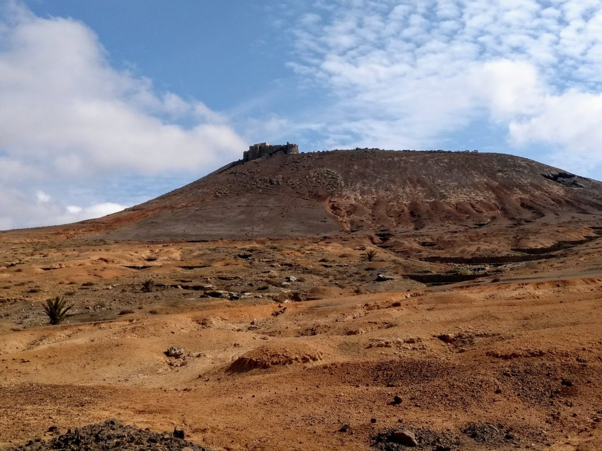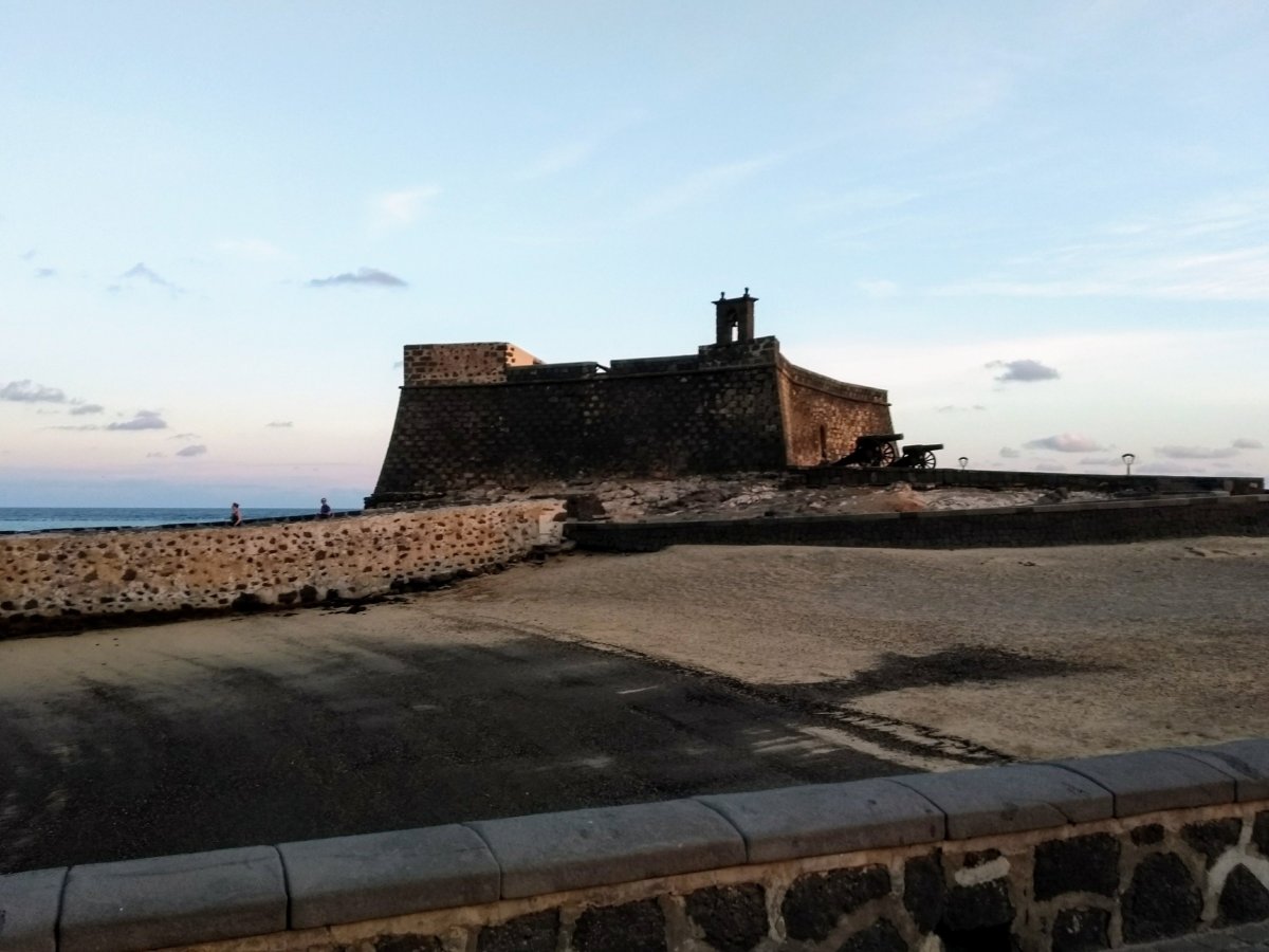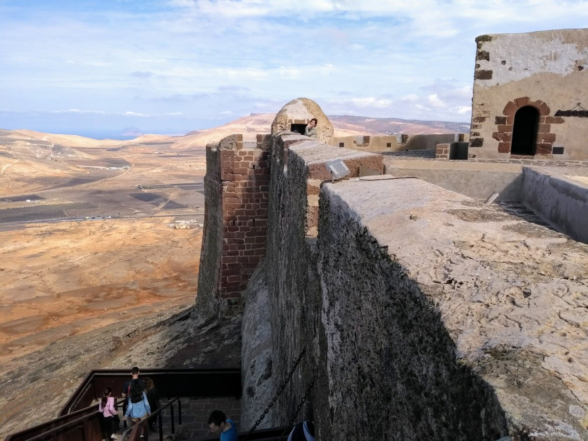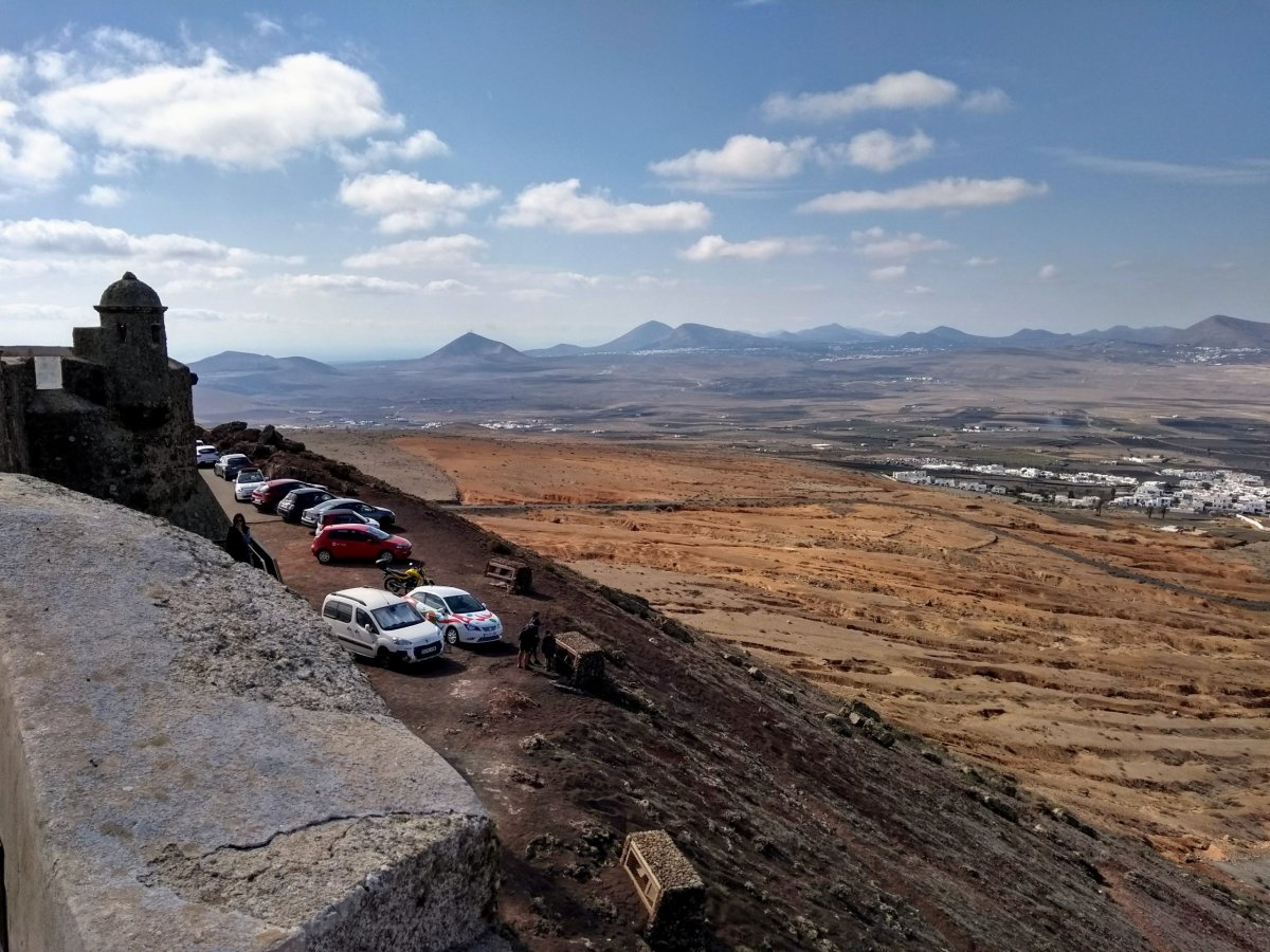 Jdeme do historického centra, které je plné lidí i stánků se vším možným. Můžete tu koupit jak různé místní výrobky, tak i mraky suvenýrů nebo celosvětově univerzálních šmejdů a cetek. Asi dvakrát si prokličkujeme uličky i celý trh a pak přeplněné městečko opouštíme. Míříme k další historické dominantě – hradu Santa Barbara, který se nachází nad městečkem na vrcholu vulkánu. Až nahoru vede asfaltka, takže parkujeme pár desítek metrů od hradu. Platíme vstupné 3 EUR za osobu a můžeme si užívat parádní vyhlídku z hradeb na celé Tenerife. Vzhledem k tomu, že Lanzarote trpělo ve středověku nájezdy nejrůznějších pirátů, kdy hrad sloužil jako útočiště místních, je dnes součástí prohlídky i muzeum pirátstsví.