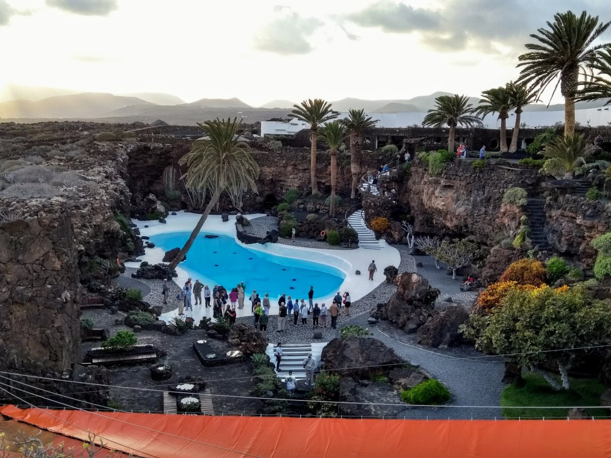 Druhým hlavním bodem dnešního programu jsou Jameos del Aqua, což jsou propadliny do lávových tunelů již v minulém odstavci zmíněných. Jde opět o dílo Césara Manrique, který zde v souladu s přírodními výtvory vystavěl kulturně-umělecké centrum, jehož součástí je i podzemní restaurace a velký kinosál. Přírodním unikátem je podzemní slané jezírko, ve kterém žije místní endemit – malý bílý ráček. Za ním už v otevřeném prostoru je pak to umělé, s azurově modrou vodou, s drsnou tropickou zahradou okolo.