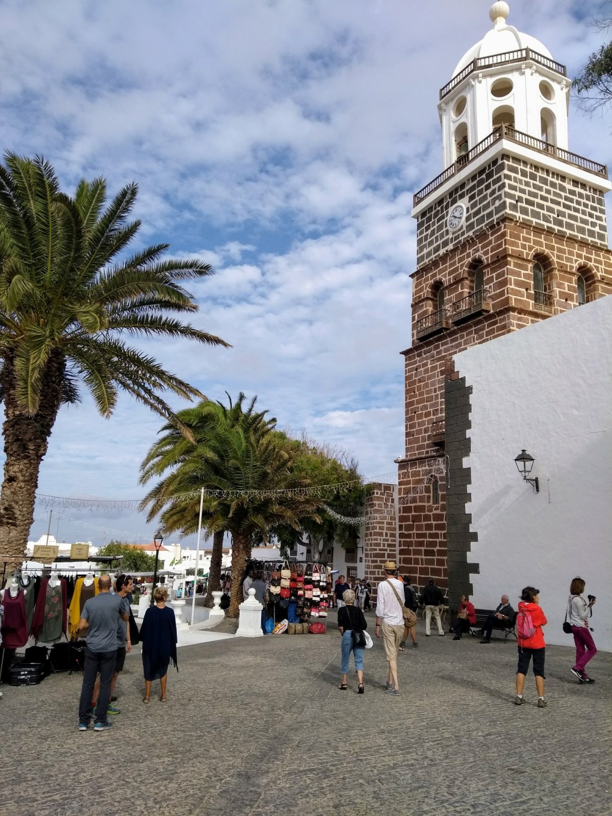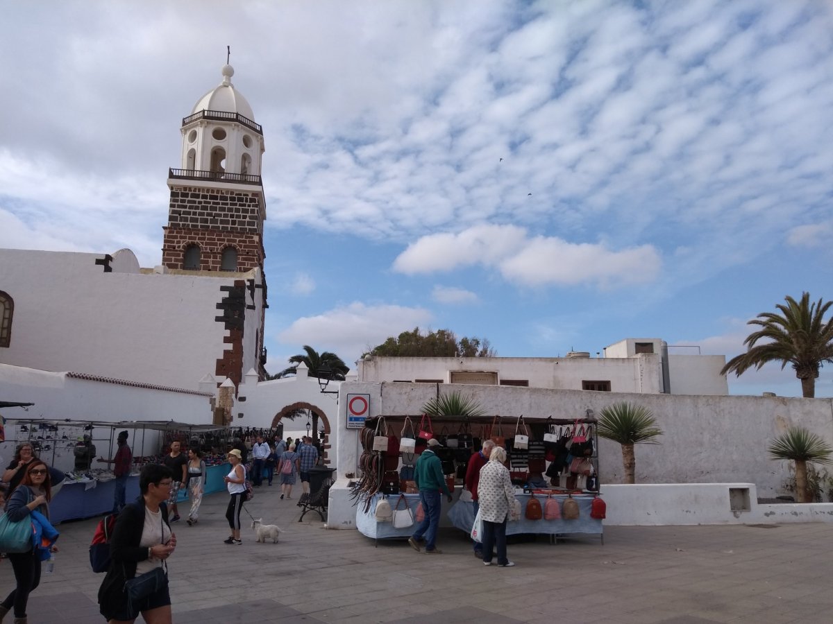 Třetí den našeho pobytu je neděle, takže po snídani sedáme do auta a vyrážíme do městečka Teguise, bývalého hlavního města ostrova, kde se každou neděli konají vyhlášené trhy a jindy ospalá víska se tak zaplní davy lidí. Dnes je chladněji, výrazně pod dvacítku, takže si bereme i bundy, ideální počasí na další výlet. Přijíždíme, stejně jako většina návštěvníků, směrem od hlavního města, a na okraji Teguise nás místní lákají na několik velkých parkovišť (za 5 EUR). My to ale zkoušíme a odbočujeme do nějaké boční ulice, kde nacházíme parkování zadarmo.