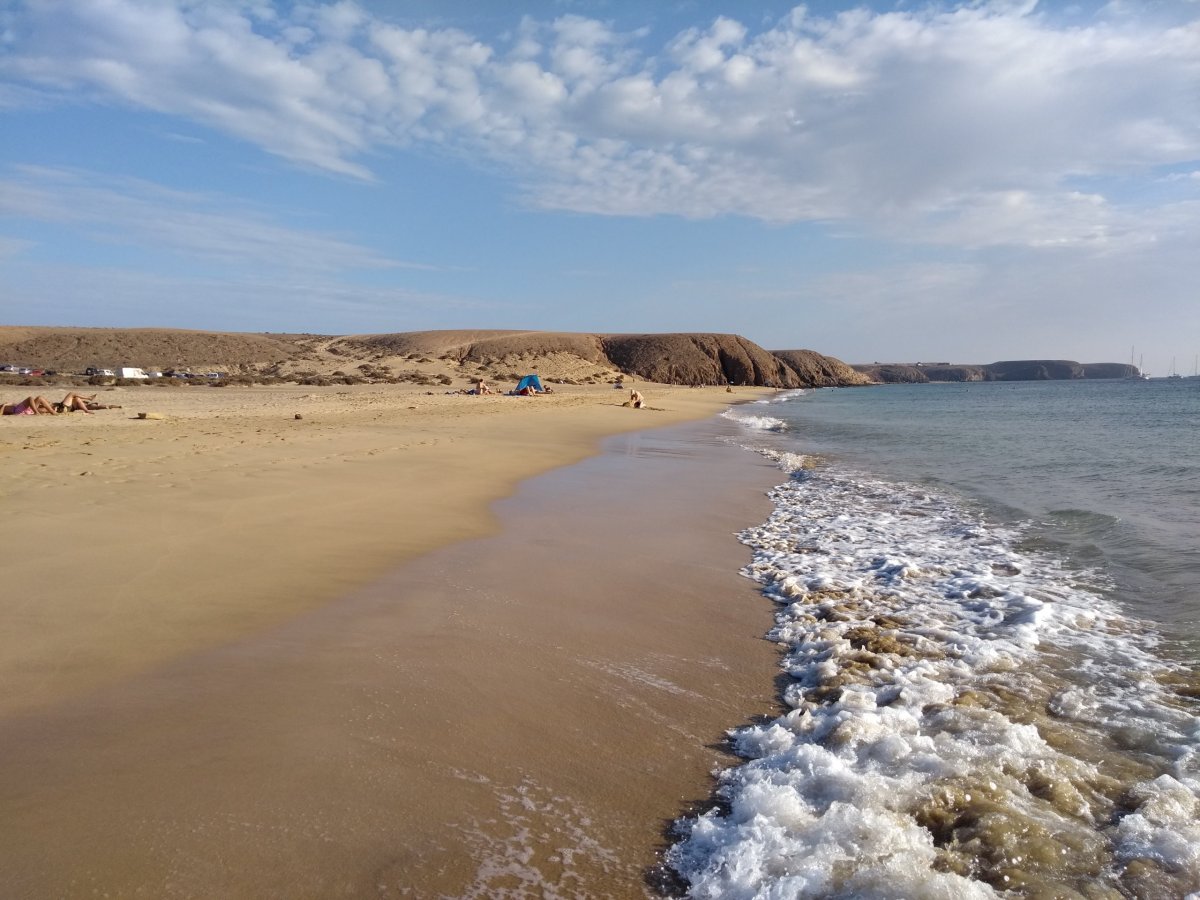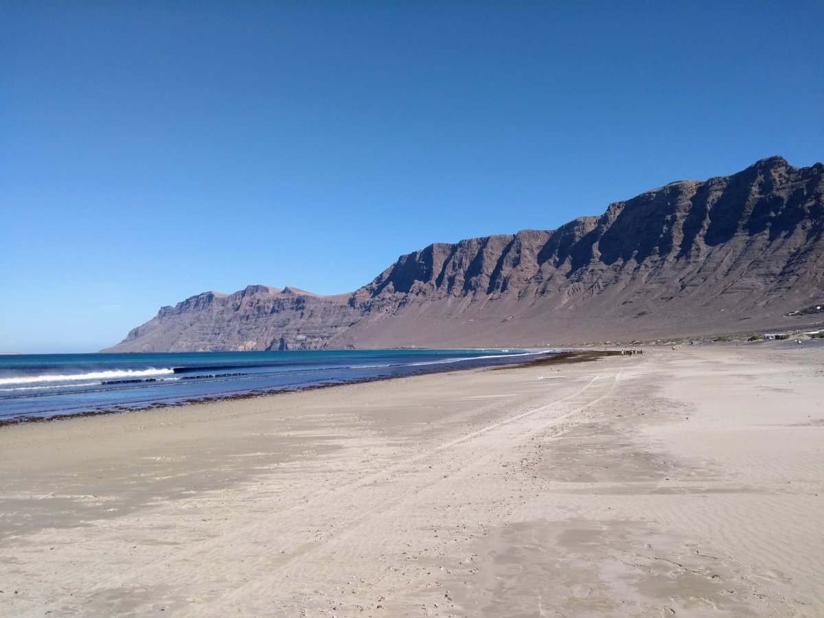 Poté sedáme do auta a přes střed ostrova jedeme na pláž Famara na severozápadě ostrova. Jedná se o asi 4 kilometry dlouhou a širokou písečnou pláž. A vhledem ke své velikosti i přes množství aut u přístupové cesty skoro liduprázdnou. Přírodní scenerie je zde jedinečná - pláž a za ní hory stoupající od hladiny oceánu do asi 600 metrů. Obrázek velmi připomínající pláž Barlovento u Cofete na vedlejší Fuerteventuře. Trávíme zde poleháváním celé odpoledne. Poslední večer pak zakončujeme večeří v jednom podniků na promenádě v Puerto.