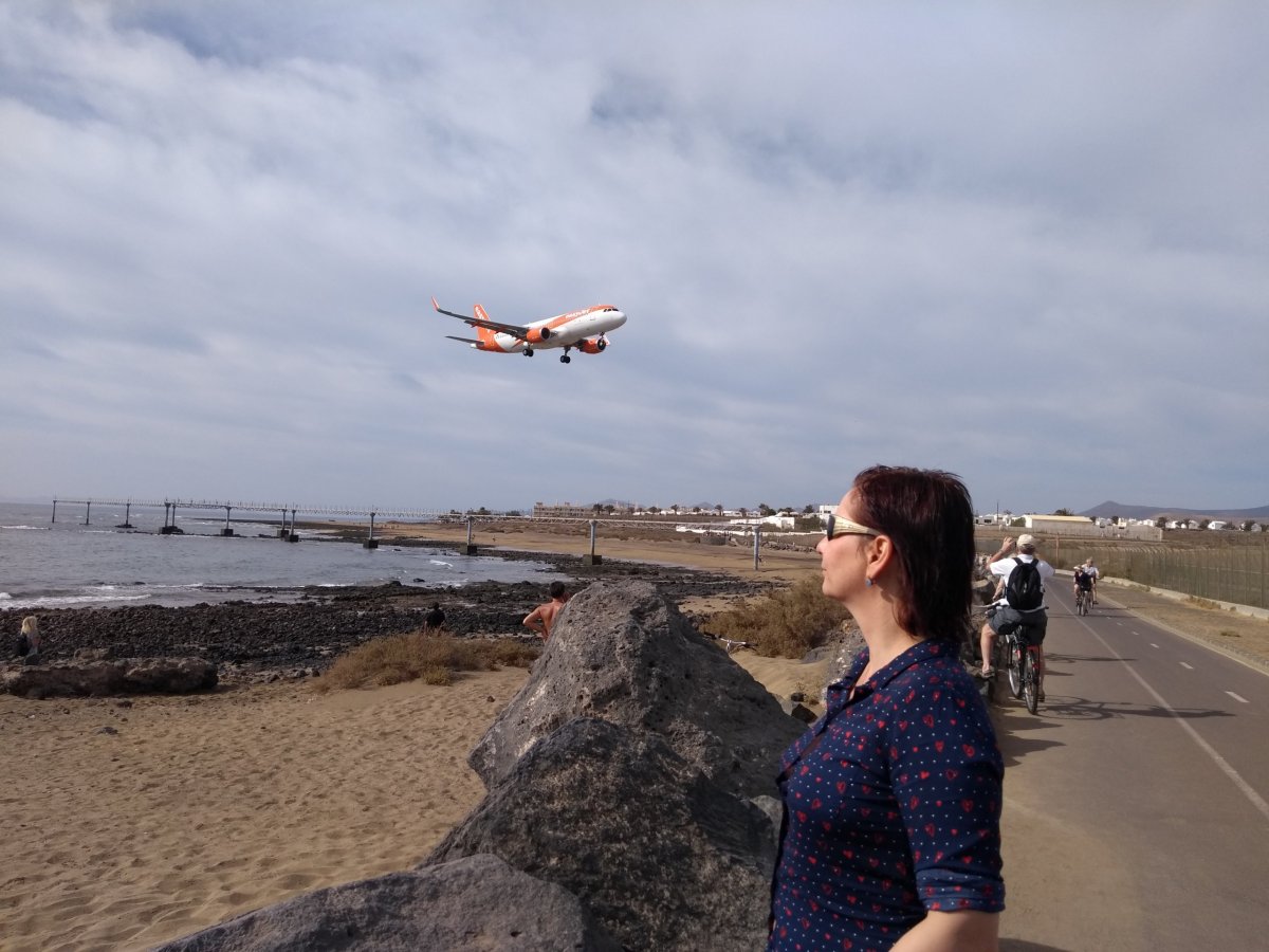 Pátý den ráno po snídani se jdeme projít k letišti, jehož přistávací dráha začíná hned za pobřežní promenádou, takže je zde možnost sledovat přistávající letadla z bezprostřední blízkosti jako na Svatém Martinu, jen zde samozřejmě nelétají ty největší stroje. Kolem oběda pak jedeme po dálnici kolem Arrecife do letoviska Costa Teguise, což je další velký umělý turistický rezort. Zcela namátkou zde někde parkujeme a jdeme směrem k moři. Místo na slunci si zabíráme na centrální pláži Playa de las Cucharas, zalidněné tak akorát. I dnes je počasí na koupání, jen holt ta teplota oceánu …