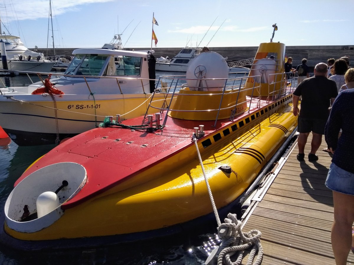 Poslední celý den na Lanzarote nás čeká zajímavý zážitek. V propagačních materiálech jsme totiž našli možnost absolvovat zde podmořský výlet ponorkou. Takže právě na tento den jsme si dopředu přes internet tuto atrakci zamluvili, kdy proti ad hoc objednávce na místě tam byla 10% sleva. Takže hned po snídani míříme do Purto Caleta, kde se hlásíme na nábřeží ve velké kanceláři společnosti Submarine Safaris, která tyto ponory pořádá. Jsme seznámeni s tím, co nás čeká, a absolvujeme bezpečnostní školení. Pak už nás průvodkyně vede k nedaleko ukotvené ponorce, která má, co byste řekli, překvapivě žlutou barvu.