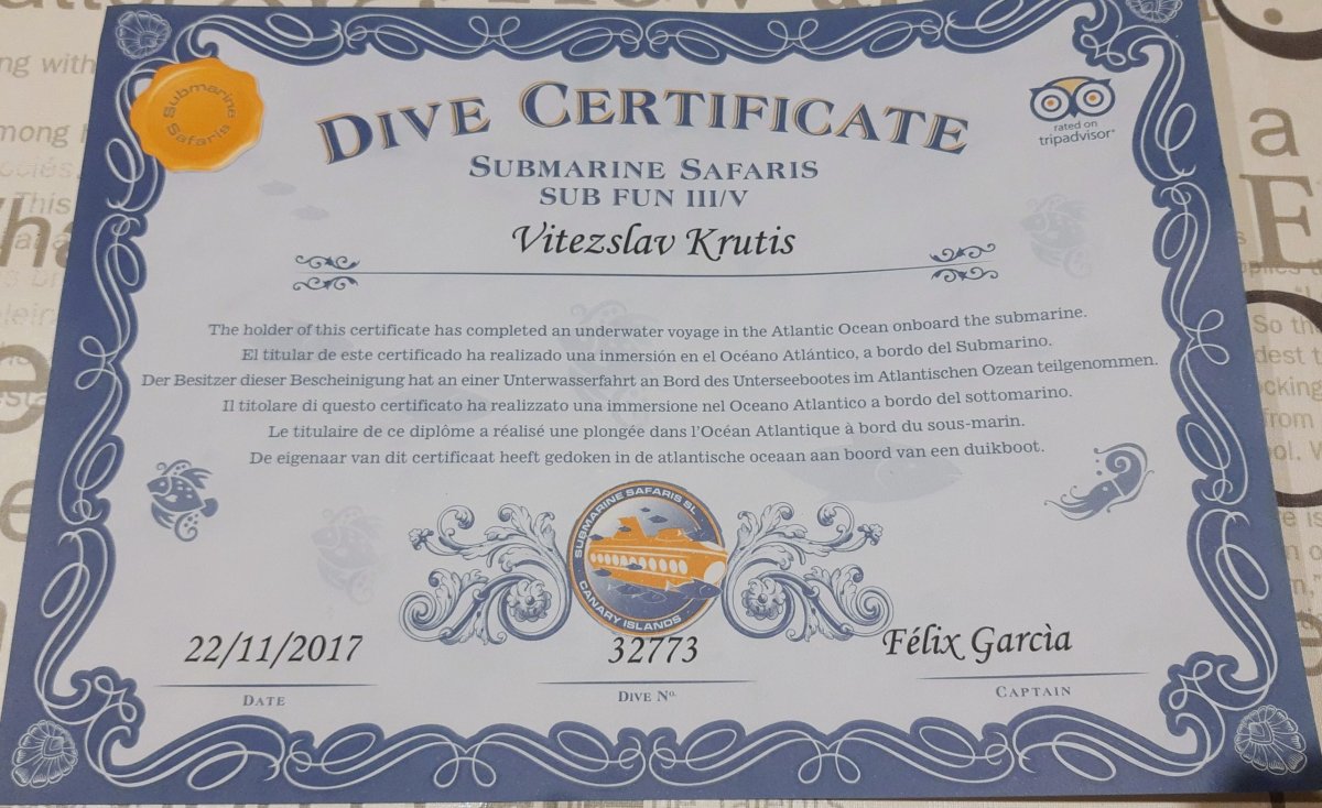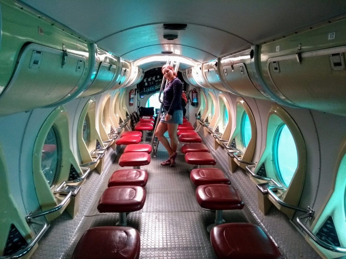 Ponorka je pro 48 lidí, po obou stranách má velká kruhová okna a před každým z nich dvě polstrované sedačky. Nás je v ponorce zhruba 30. Vyplouváme z přístavu a za ním se už vydáváme pod vodu. Místní oceánská flora i fauna nejsou nikterak pestré, takže v první fázi ponoru je nejzajímavější, když míjíme několik potopených vraků lodí. To nejlepší přichází na obrátce, kde ponorka zastavuje a kolem nás se začínají míhat hejna ryb. Před okny defiluje i potápěč se svým mazlíkem – asi 3-metrovým rejnokem. Jde samozřejmě o nacvičené představení, ale vidět plavat takové monstrum v jeho přirozeném prostředí je nezapomenutelný zážitek. Výlet a vynoření končí za doprovodu skladby legendárních Beatles – Yellow Submarine. Během zhruba hodinové platby jsme se dostali nejhlouběji asi do 35 metrů a jako potvrzení, že jsme tento zážitek absolvovali, nakonec dostáváme certifikát o ponoru.