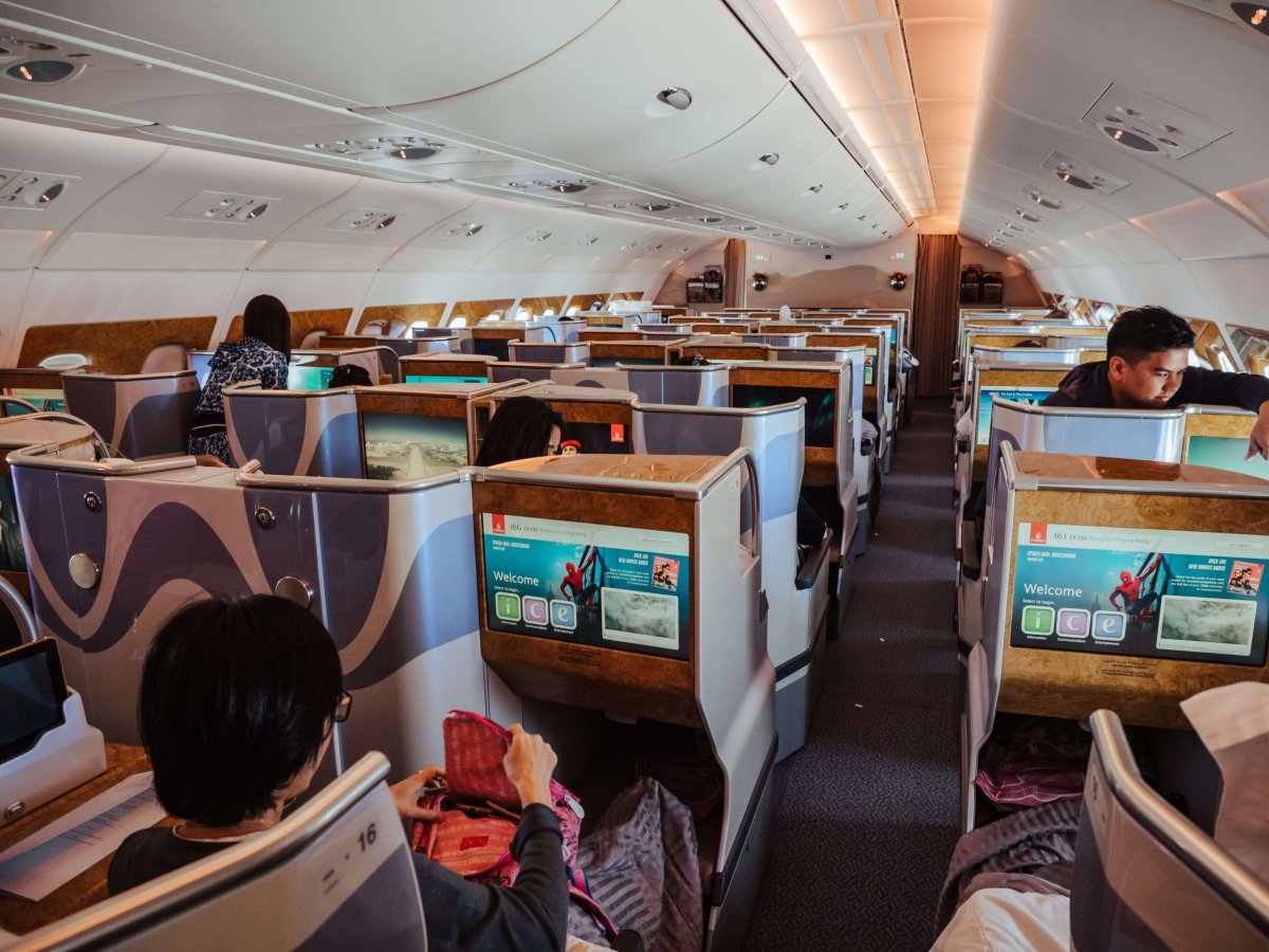 Jedna z mnoha výhod, kvůli které člověk utrácí za letenky v byznys třídě více, než je nutné, je pohodlí. Pohodlí nejen během letu, ale i nástupu a výstupu z letadla. V případě A380tek to stejně jako u prioritního odbavení prostě neplatí. V byznys konfiguraci se nachází 56 sedadel, které jsou v našem případě plně obsazené, a proto menší fronta vzniká i při nastupování. V porovnání se zbylými 557 sedadly v ekonomické třídě to však zní jako klišé.