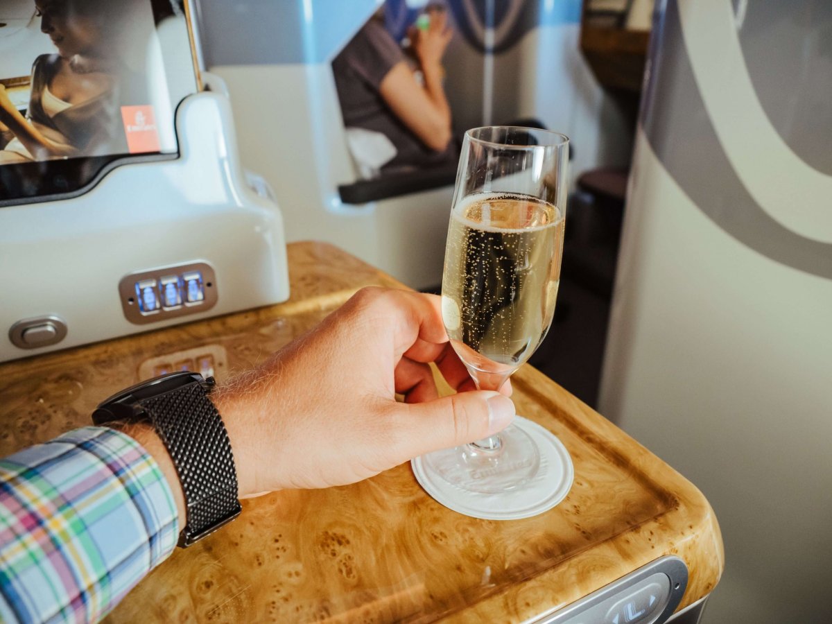 Krátce po usednutí ke mne přichází letuška a nabízí šampaňské k přípitku. Tak na zdraví.